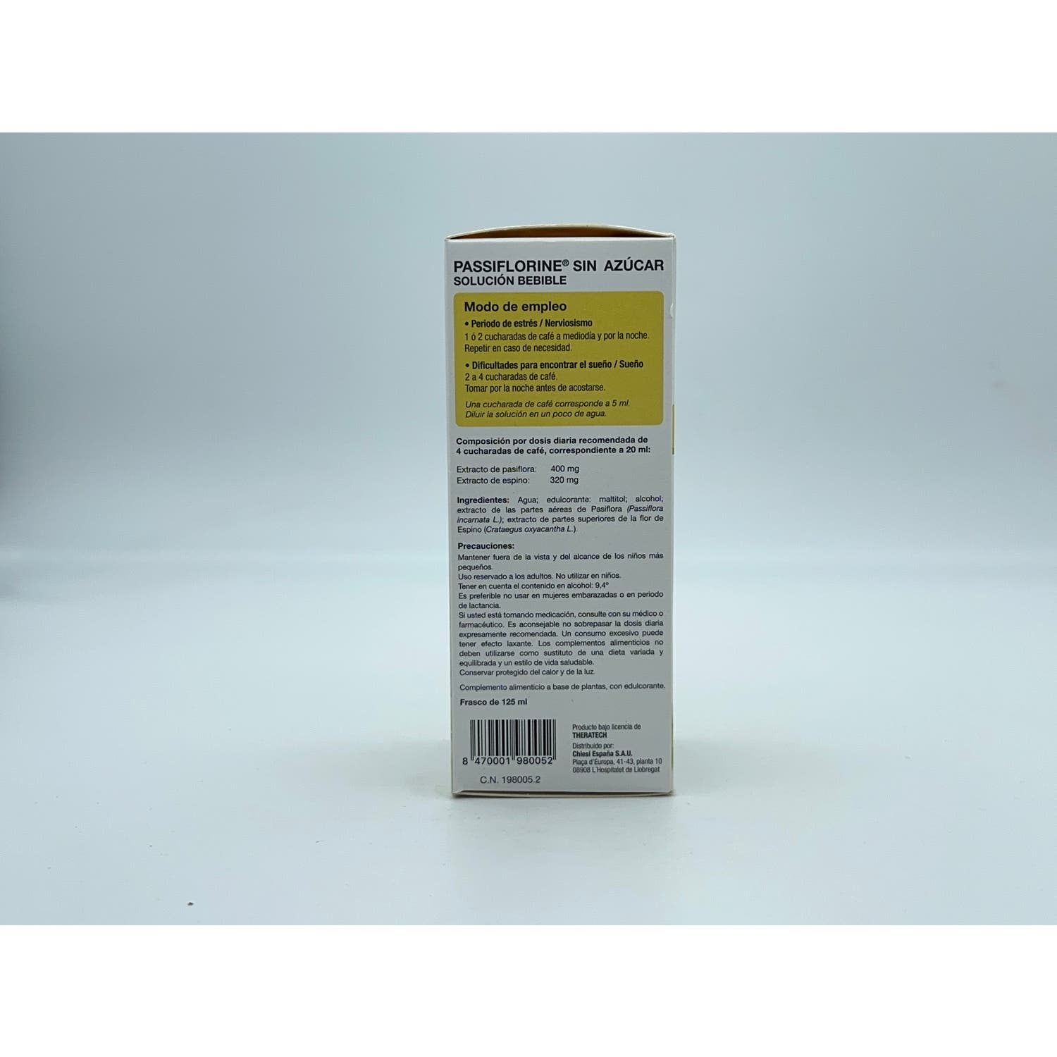 Passiflorine Sin Azúcar 125ml es un complemento alimenticio en solución bebible, con ingredientes 100% naturales, seleccionados rigurosamente para ayudar de forma natural a afrontar el estrés y el sueño perturbado.