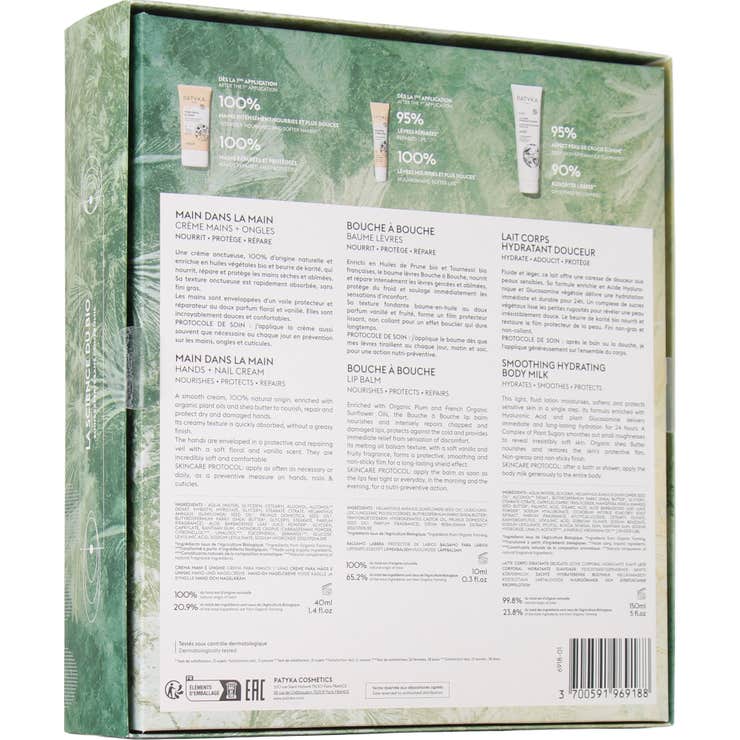 Patyka Pack Cofre Rituel Nutri Douceur reúne los tratamientos esenciales de la línea Nutri-Douceur de Patyka para el cuidado corporal de pieles secas, sensibles y muy sensibles. Ofrece una hidratación profunda orientada a nutrir, reparar y calmar la piel, con texturas cremosas y bálsamos fundentes para un ritual de confort.