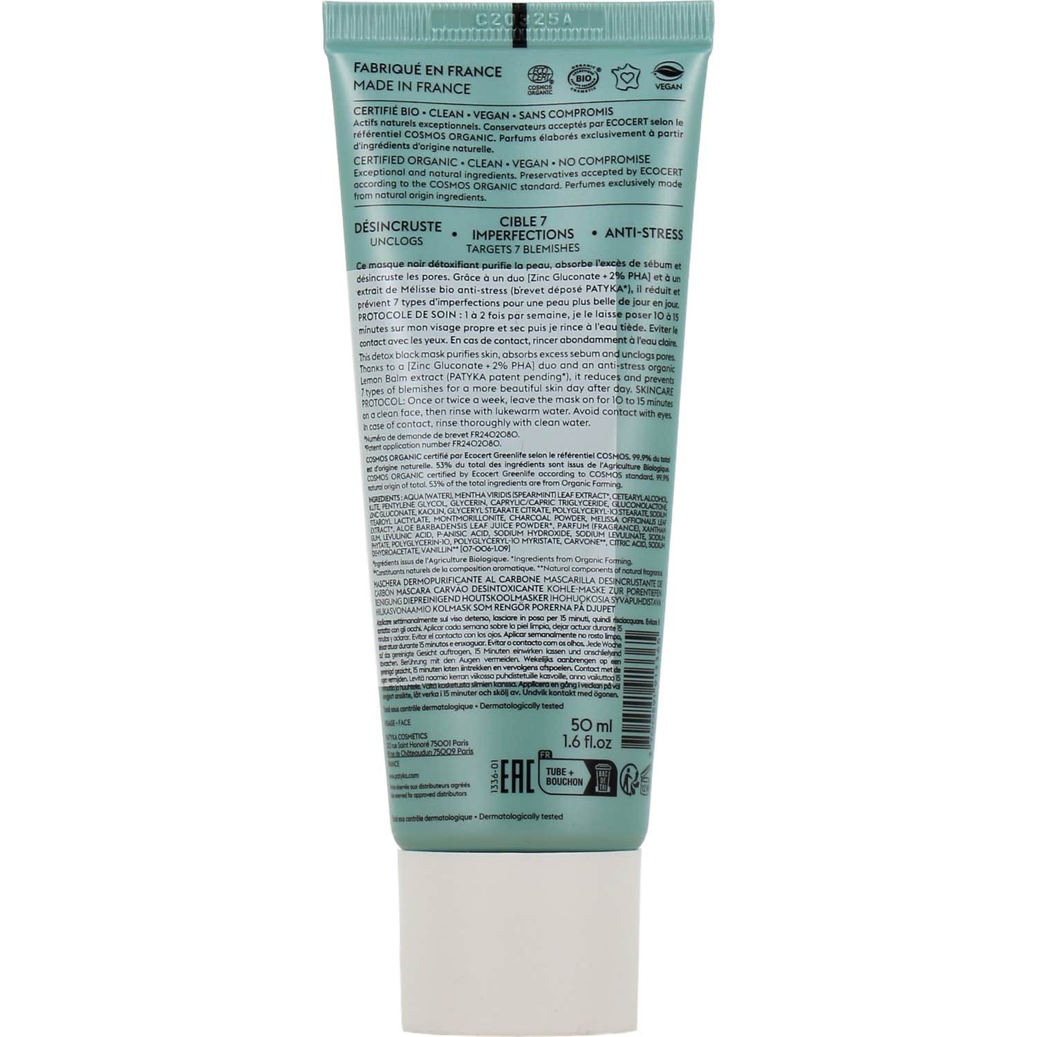 La mascarilla contiene un innovador complejo de activos, que incluye Gluconato de Zinc y un 2% de PHA/Gluconolactona, así como extracto de melisa bio, que contribuyen a su acción anti-estrés y purificadora. El carbón vegetal atrapa toxinas, mientras que la arcilla verde ayuda a equilibrar la epidermis de manera delicada.