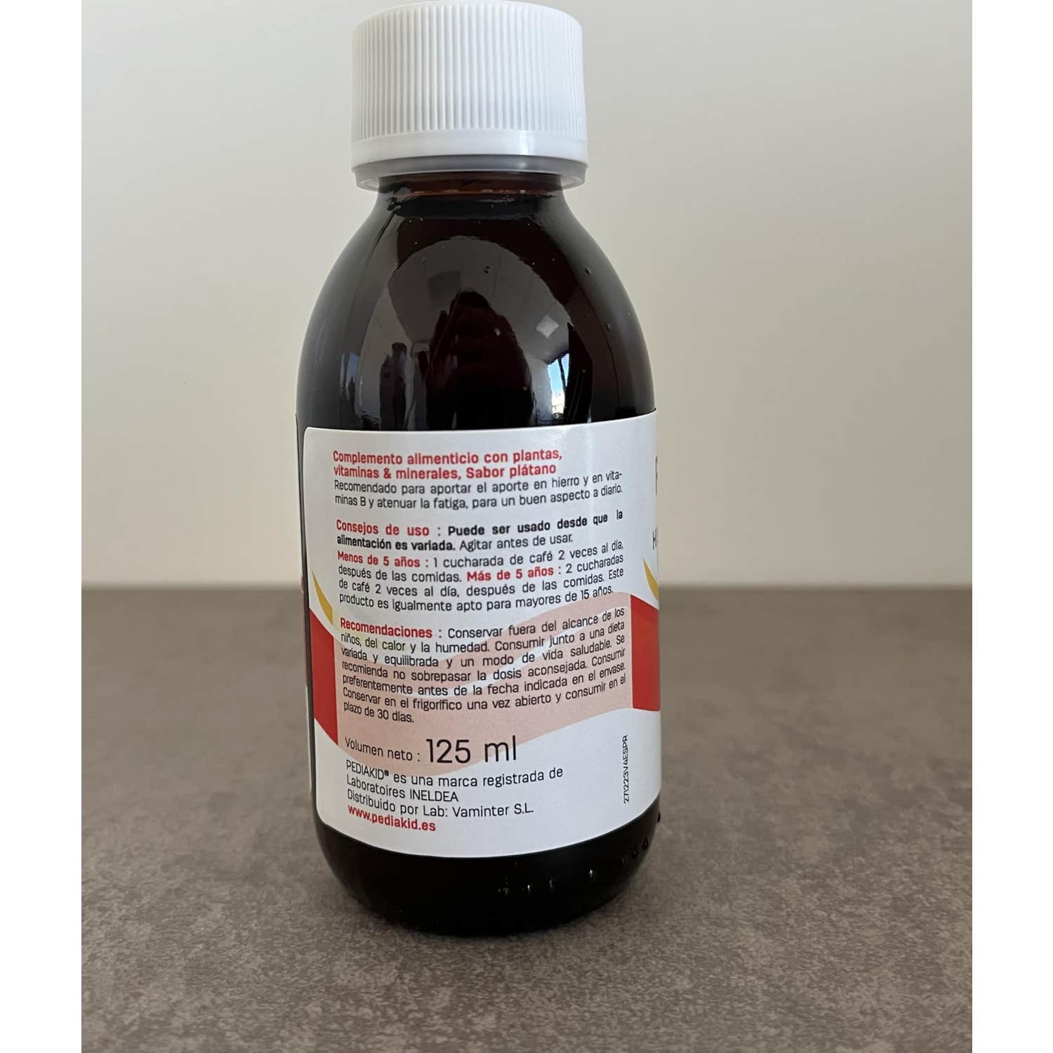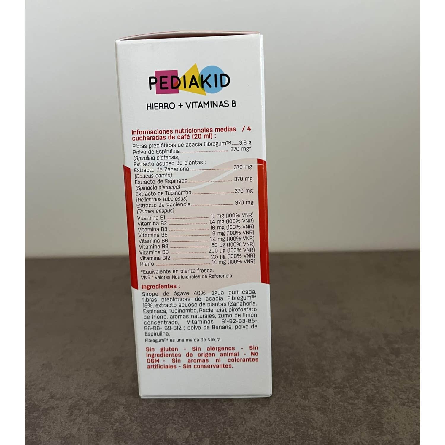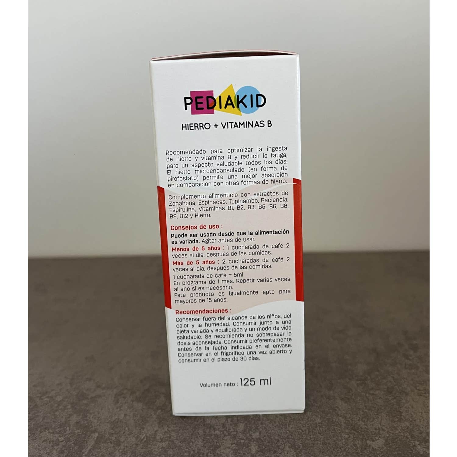 Pediakid Hierro + Vitaminas Jarabe 125ml es un complemento alimenticio que ayuda a tratar el cansancio y la fatiga al optimizar el consumo del hierro, su contenido de vitamina B2 favorece el metabolismo del hierro para mejorar su uso por el organismo. También ayuda al metabolismo energético y contribuye a mejorar el transporte del oxígeno hacia las células. El jarabe está elaborado a base de extractos de zanahoria, espirulina, tupinambo, espinaca, acedera, hierro, vitamina B1 - B2 - B3 - B5 - B6 - B8 - B9 y B12.Indicado para niños y adolescentes.