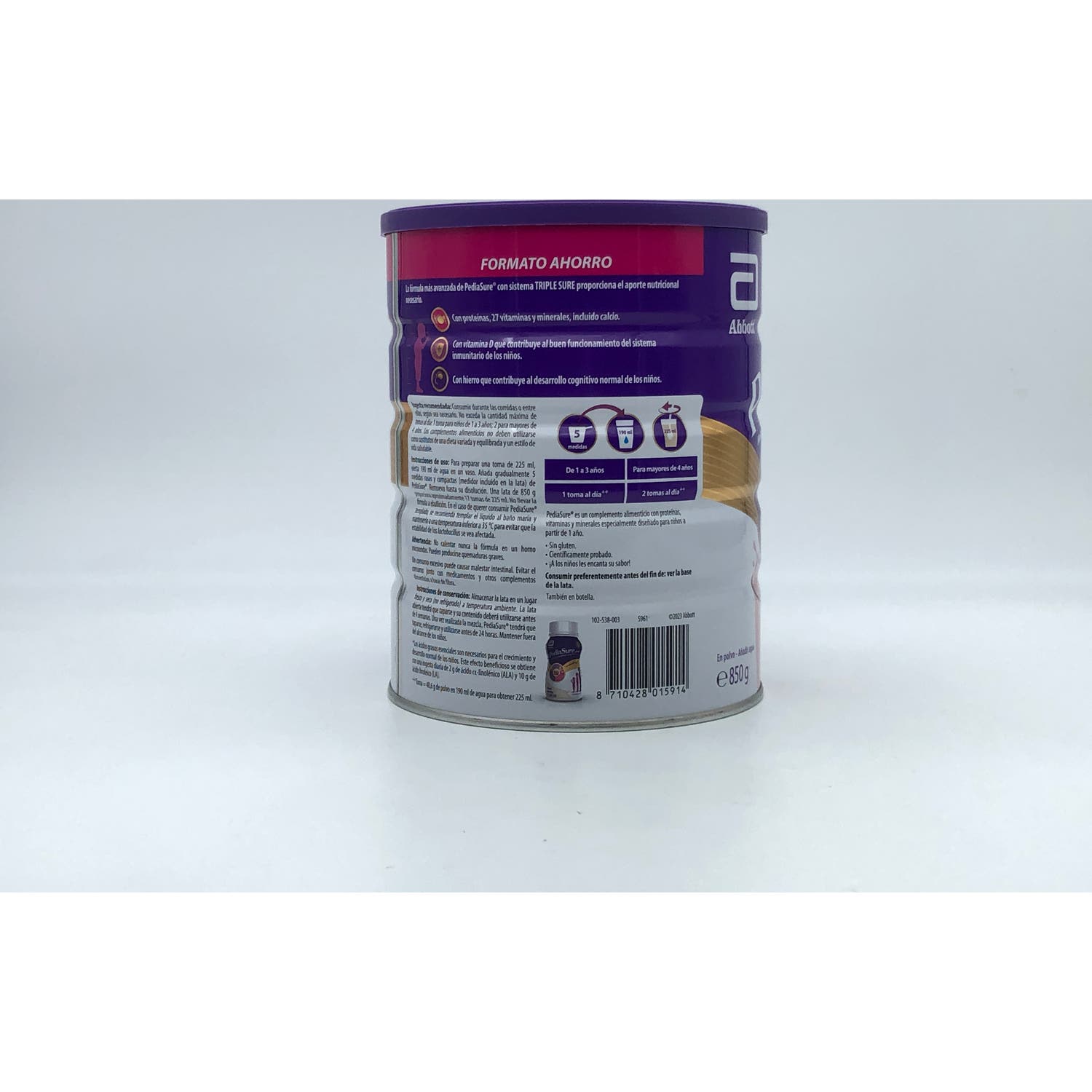 Para preparar 225 ml para administración oral, verter 190 ml de agua en un vaso. Añadir gradualmente 5 medidas rasas y compactas (medidor incluido en la lata) de PediaSure. Remover hasta su disolución. Una lata de 850g proporciona aproximadamente 17 tomas de 225 ml. No llevar la fórmula a ebullición. En el caso de querer consumir PediaSure templado, se recomienda templar el líquido al baño maría y mantenerlo a una temperatura inferior a 35oC para evitar que la estabilidad de los lactobacillus se vea afectada. Advertencia: No calentar nunca la fórmula en un horno microondas. Pueden producirse quemaduras graves. No superar la dosis diaria recomendada. Los complementos alimenticios no son sustitutivos de una dieta equilibrada y un modo de vida saludable. Mantener alejado del alcance de los niños más pequeños.