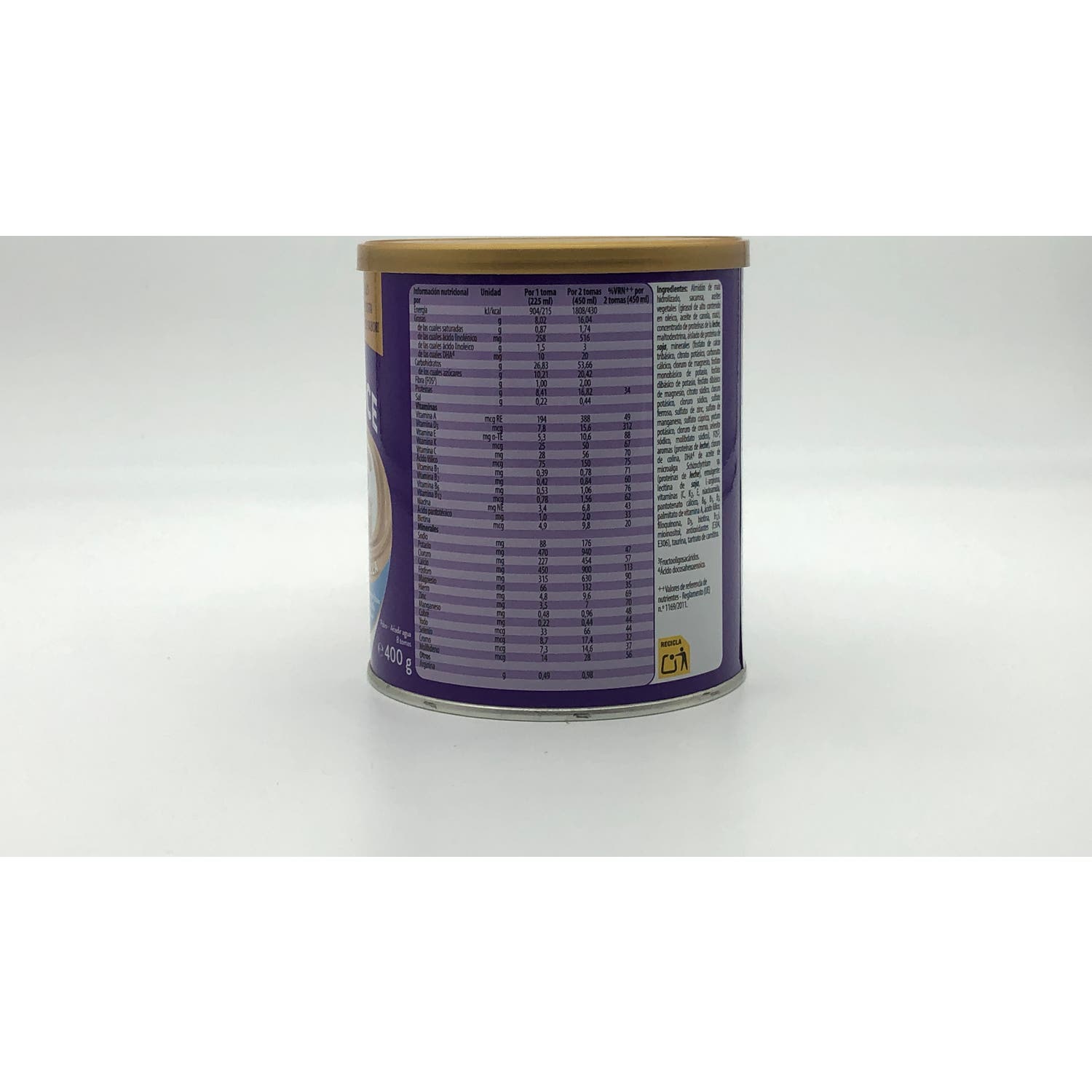 Almidón de maíz hidrolizado, sacarosa, aceites vegetales (girasol de alto contenido en oleico, aceite de canola, maíz), concentrado de proteínas de la LECHE, maltodextrina, aislado de proteína de SOJA, minerales (fosfato de calcio tribásico, citrato potásico, carbonato cálcico, cloruro de magnesio, fosfato monobásico de potasio, fosfato dibásico de potasio, fosfato dibásico de magnesio, citrato sódico, cloruro potásico, cloruro sódico, sulfato ferroso, sulfato de zinc, sulfato de manganeso, sulfato cúprico, yoduro potásico, cloruro de cromo, selenito sódico, molibdato sódico), cacao en polvo, FOS7, aroma, cloruro de colina, DHA8 de aceite de microalga Schizochytrium sp. (proteínas de LECHE), emulgente: lecitina de SOJA, L-arginina, vitaminas (C, K2, E, niacinamida, pantotenato cálcico, B6, B1, B2, palmitato de vitamina A, ácido fólico, filoquinona, D3, biotina, B12), mioinositol, antioxidantes (E304, E306), taurina, tartrato de carnitina. SIN GLUTEN.