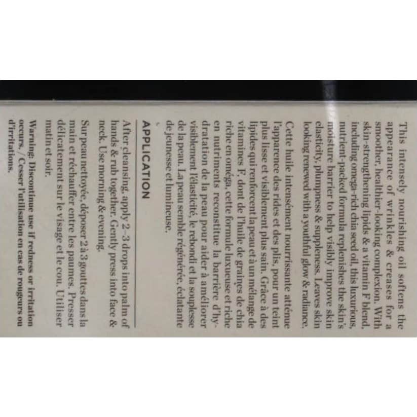Asimismo, está enriquecido con vitamina F y aceites de semilla de chía, lino y macadamia; ingredientes que aportan elasticidad y flexibilidad a la piel del cutis. Contiene 30ml.