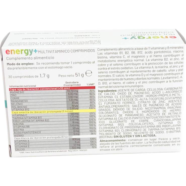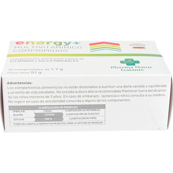 Pharma Natur Galante Energy+ Multivitamínico es un complemento alimenticio que presenta 30 comprimidos de liberación diferenciada. Este producto ha sido formulado con un total de 11 vitaminas y 8 minerales esenciales, destinados a satisfacer las necesidades nutricionales en momentos de alta exigencia física o mental.