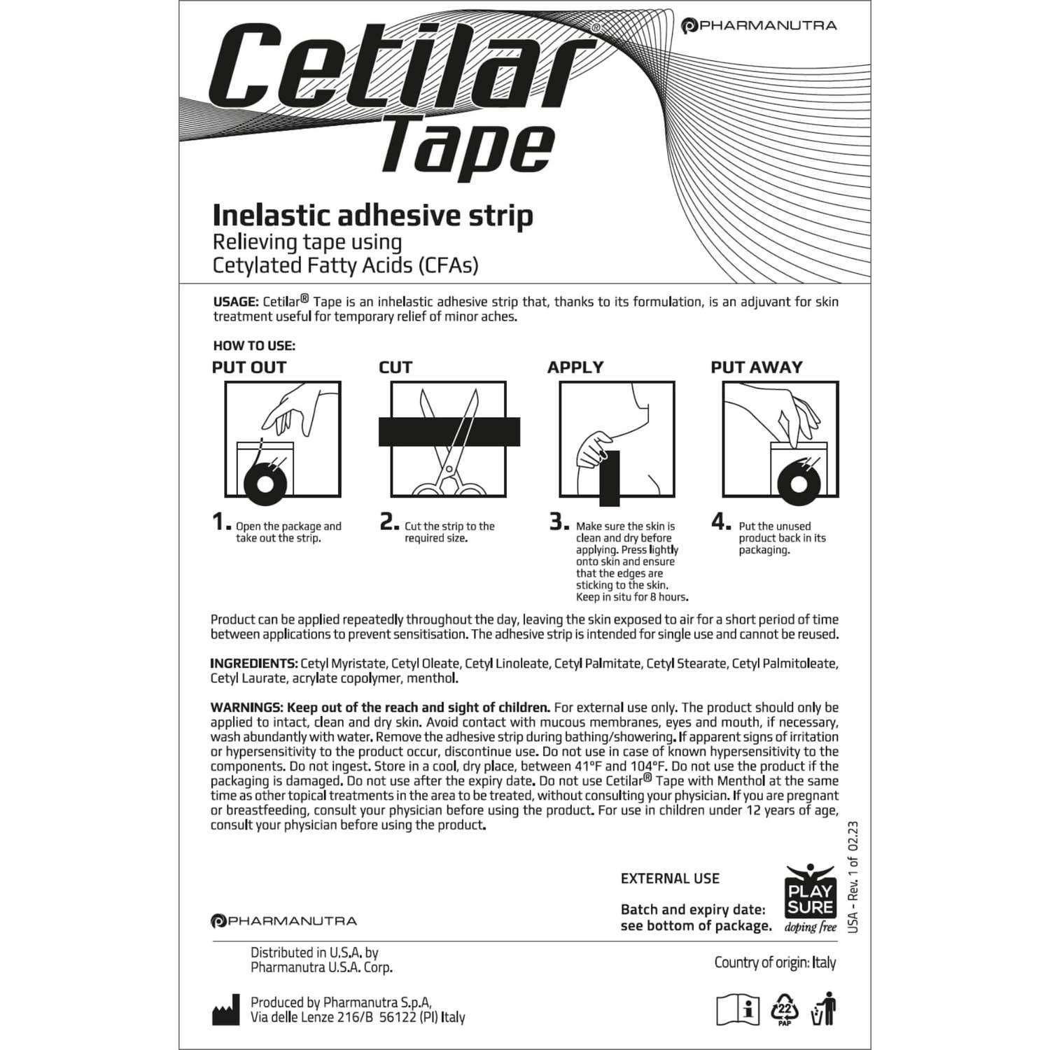 Pharmanutra Cetilar Tape es una tira adhesiva no elástica formulada con ésteres cetílicos de origen vegetal para el tratamiento de afecciones articulares relacionadas con la osteoartritis, con el fin de: