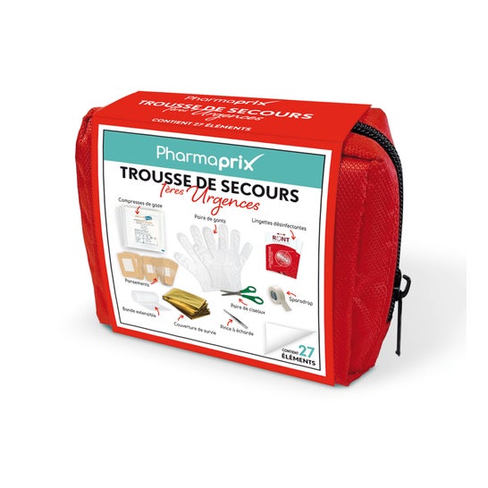 Botiquín de primeros auxilios con material básico para uso familiar. Contiene los siguientes elementos:
