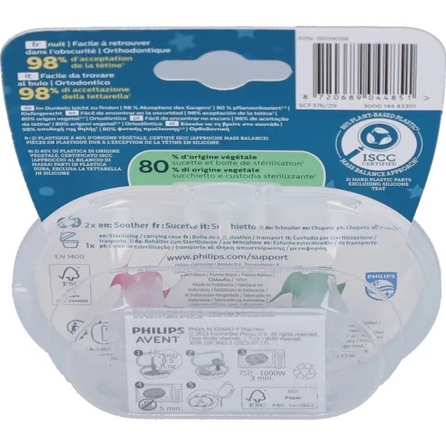 Está fabricada con un 80% de materiales de origen vegetal, lo que refleja el compromiso de la marca con la sostenibilidad y la reducción del impacto ambiental. Tanto la caja como la chupeta están compuestas de elementos ecológicos.