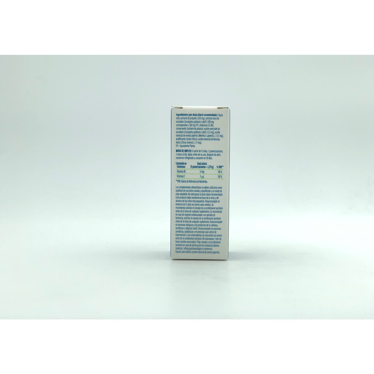 Agua, miel, extracto de própolis (250 mg), extracto seco de eucalipto (Eucalyptus globulus Labill.) (100 mg corresponden a 300 mg EP), vitaminas (D, B6), conservante (sorbato de potasio), aceite esencial de eucalipto (Eucalyptus globulus Labill.) (2,5 mg), aceite esencial de menta piperita (Mentha X. piperita L.) (1,5 mg), acidificante (ácido cítrico) y aceite esencial de Naranja dulce (Citrus sinensis L.) (1 mg).