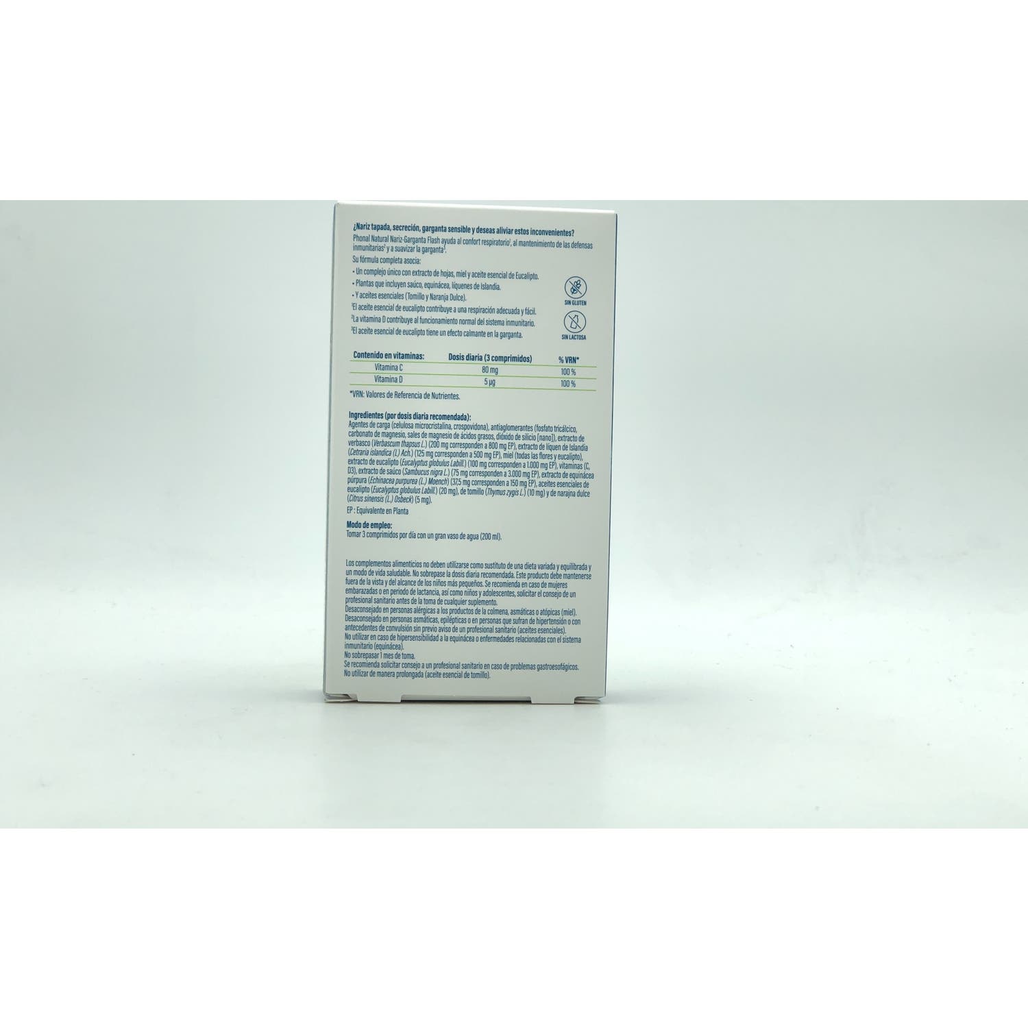 Formulado con Eucalyptus EAM® (un complejo exclusivo que asocia extracto de hojas, miel y aceite esencial de eucalipto), saúco, equinácea, líquenes de Islandia, aceites esenciales de tomillo y naranja dulce, vitaminas C y D.