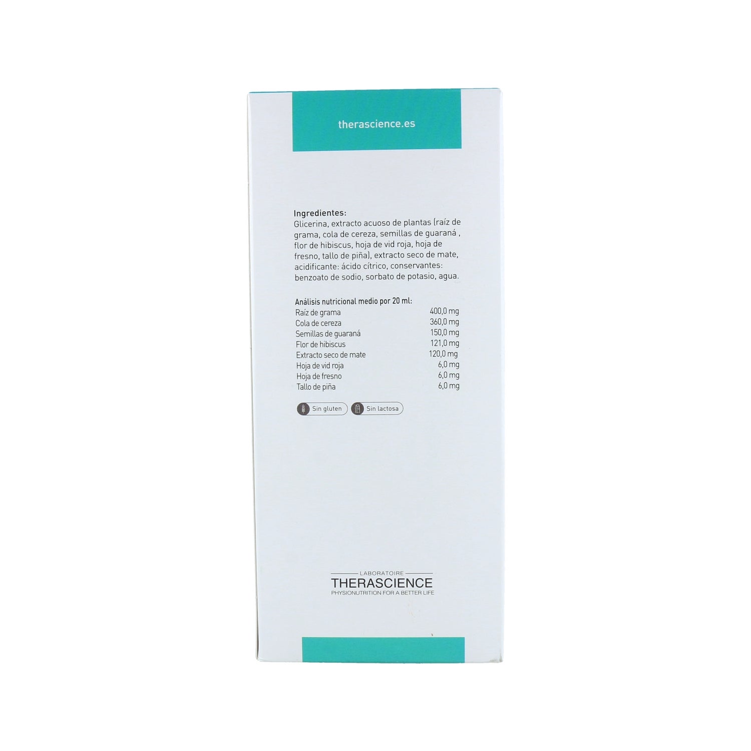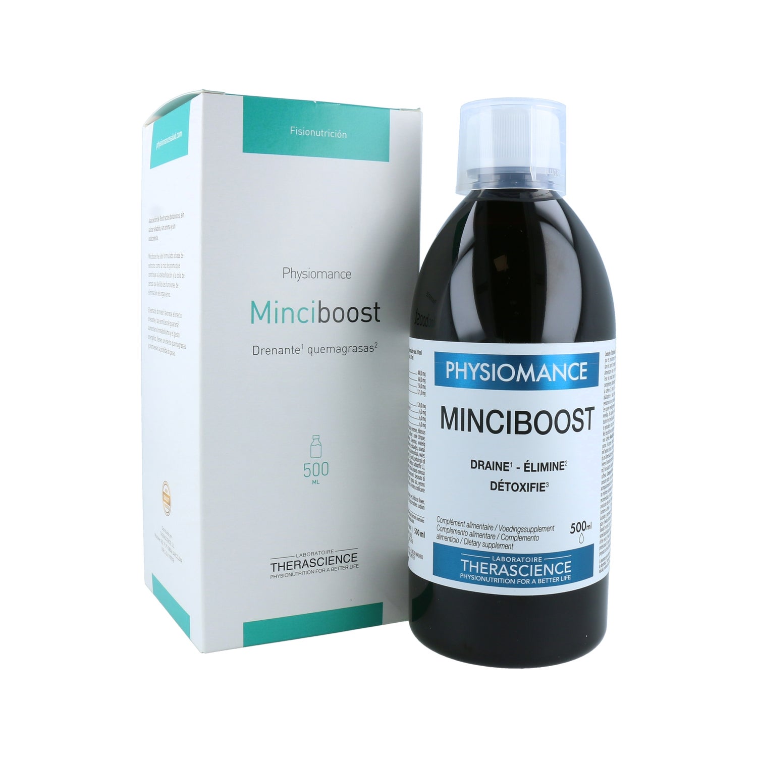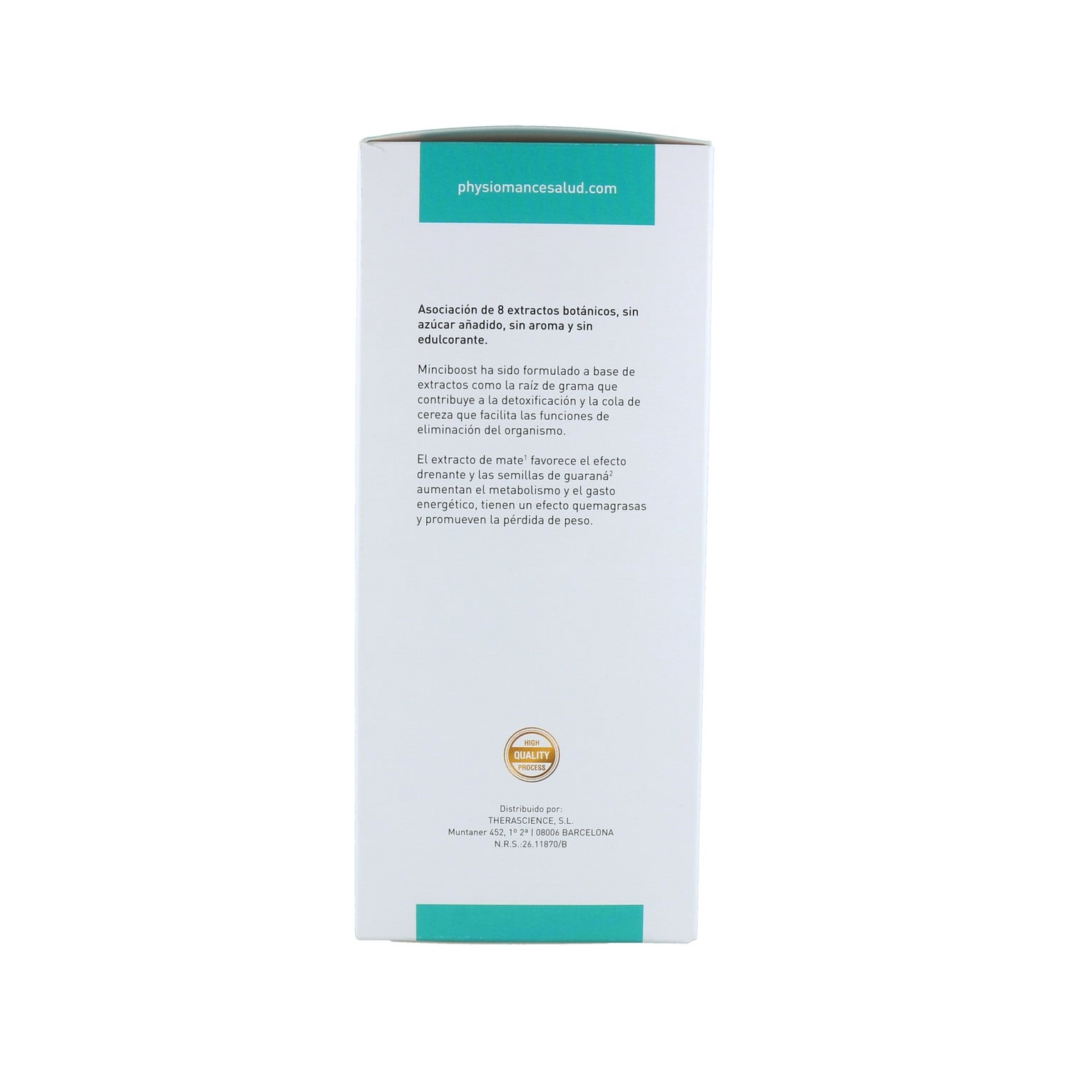 Therascience Physiomance Minciboost 500ml está formulado a partir de una mezcla de 8 plantas para favorecer la pérdida de peso.Las semillas de guaraná contribuyen a aumentar la actividad metabólica, lo que se traduce en un mayor gasto energético y favorece la pérdida de peso.El extracto seco de yerba mate, gracias a su efecto drenante, favorece la evacuación del agua del organismo. Se complementa con la acción diurética del extracto de fresno para drenar y combatir la retención de líquidos.La raíz de grama y el tallo de cereza tienen fuertes propiedades drenantes y desintoxicantes.La hoja de vid roja ayuda a mejorar la circulación sanguínea y a aliviar la pesadez de piernas. El extracto de hibisco, rico en polifenoles, ayuda a reducir la grasa corporal. La raíz de hierba y el tallo de cereza ayudan a eliminar las sustancias nocivas del organismo, mientras que el tallo de piña, rico en bromelina, favorece la digestión facilitando la eliminación de los productos de desecho.Diseñado sin azúcares, aromas ni colorantes añadidosLos complementos alimenticios nunca deben sustituir a una dieta sana y equilibrada.