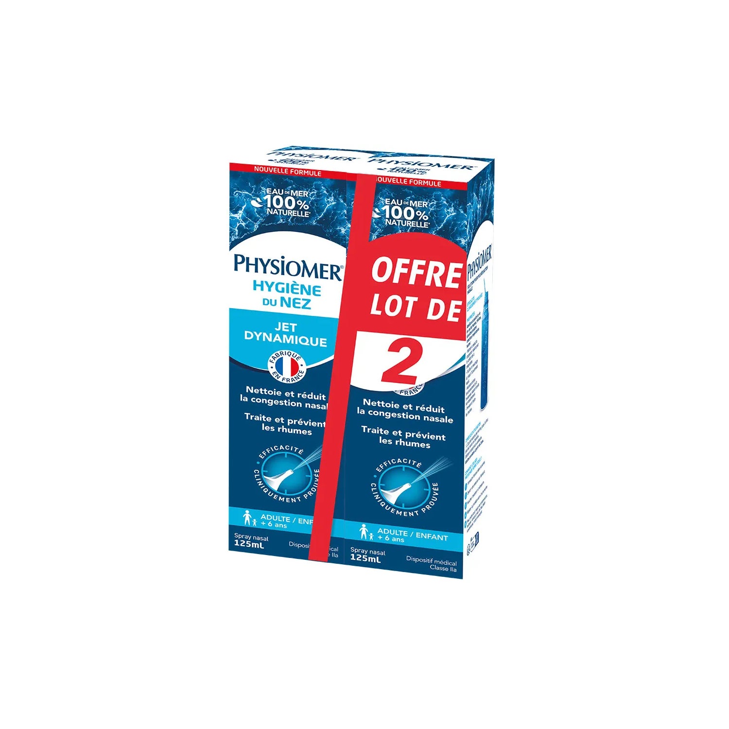Physiomer Hygiène du Nez Jet Dynamique 2x125 ml es una solución formulada a base de agua de mar natural para limpiar, hidratar y aliviar la congestión nasal (resfriados, rinitis, etc.) Su fórmula contiene numerosos minerales y oligoelementos que ayudan a limpiar las fosas nasales, favorecen la eliminación de la mucosidad a la vez que hidratan la mucosa nasal y ayudan a protegerla contra las infecciones. 100% agua de mar natural. Estéril. Este producto es apto para adultos y niños a partir de 6 años.