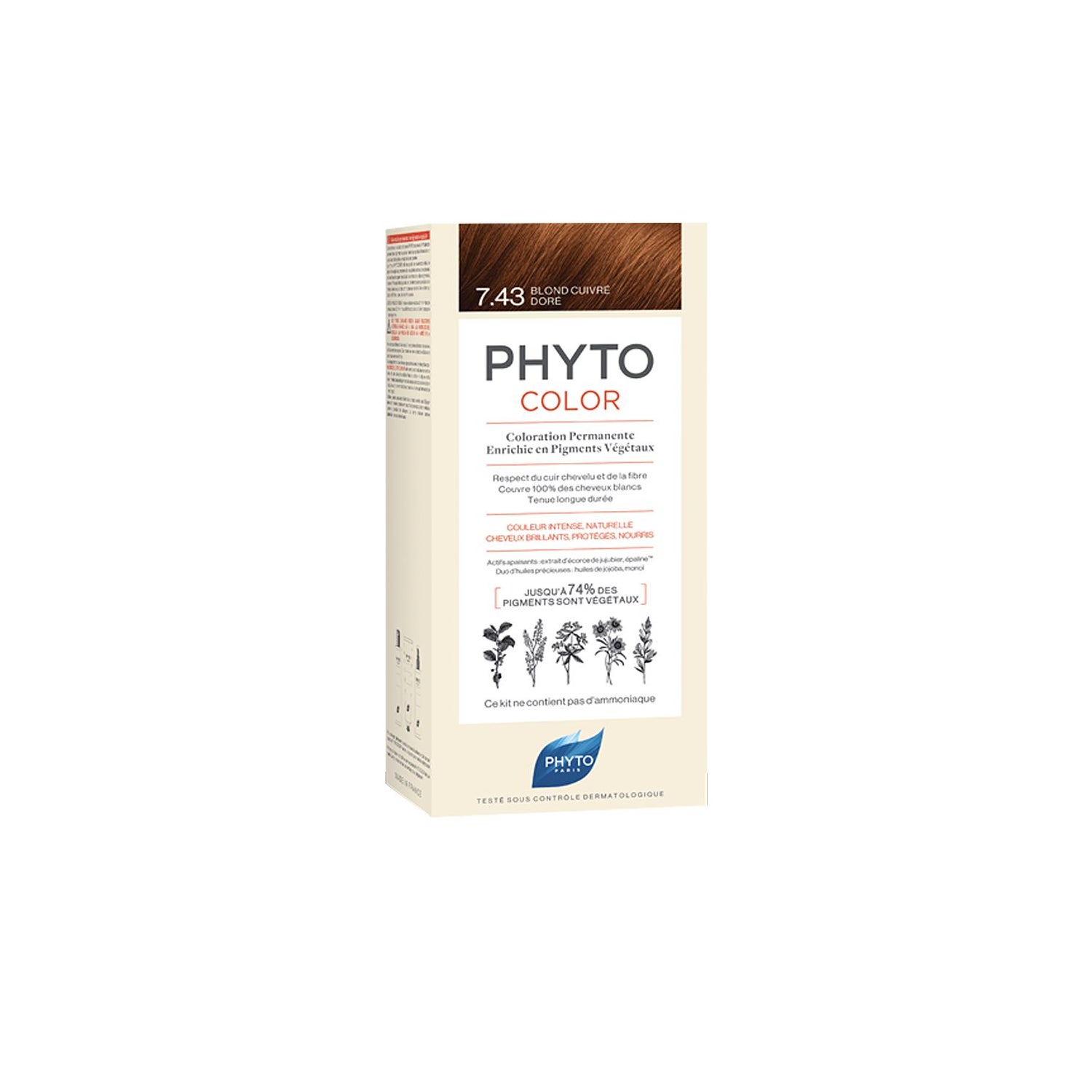 El Kit Phyto Kit Phytocolor Box 7.43 Rubio Cobrizo Dorado es un conjunto de coloración permanente para el cabello creado por los expertos coloristas de PHYTO. Su fórmula, a base de pigmentos vegetales sin amoniaco, garantiza un color intenso, natural y luminoso gracias a la presencia de una mezcla de pigmentos vegetales extraídos de cinco plantas tintóreas. Estos pigmentos cubren el 100% de las canas desde la primera aplicación. Además, el kit contiene aceites de Monoi y Jojoba que realzan el color, junto con dos activos calmantes para una coloración suave.
