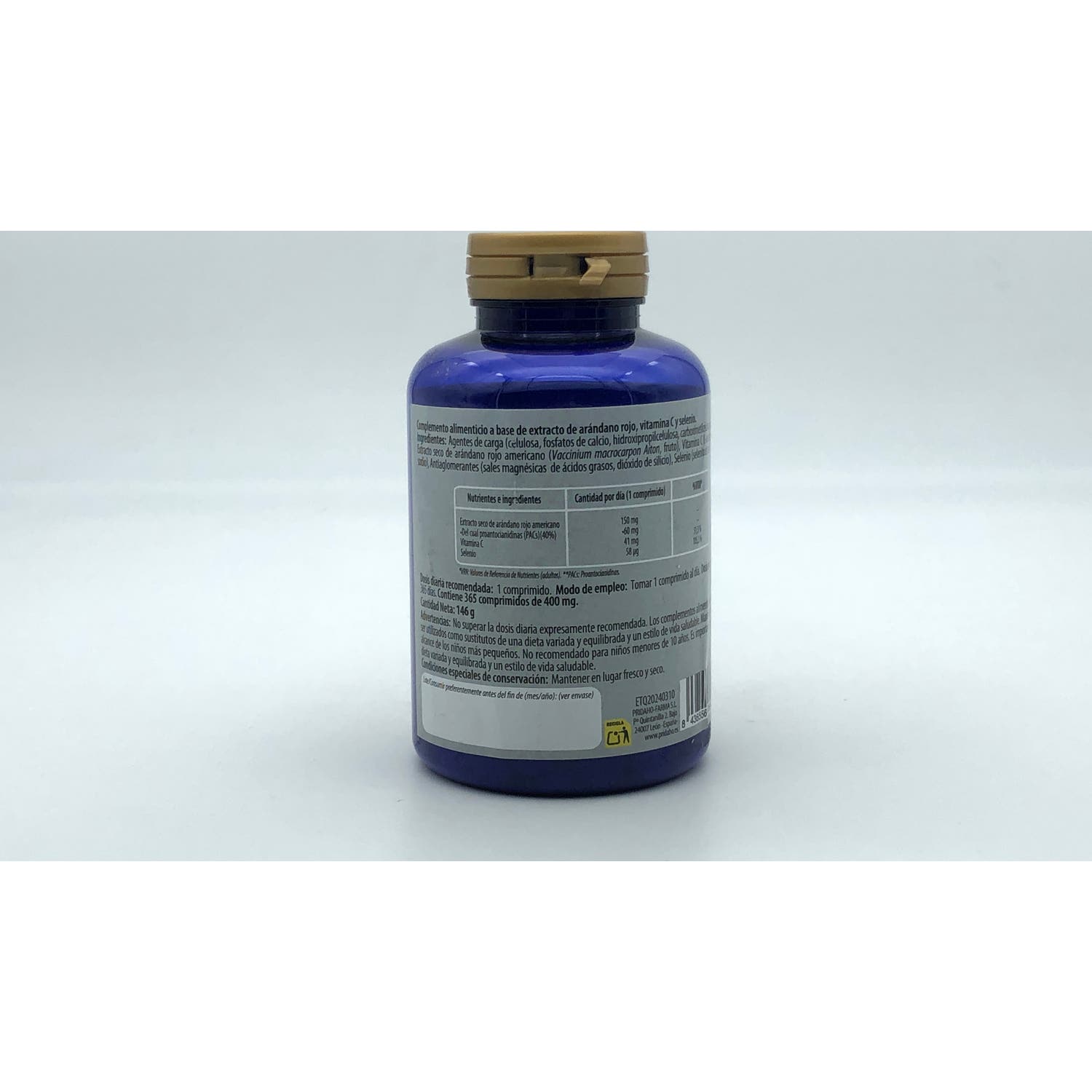 Agentes de carga (Celulosa, Fosfatos de calcio, Hidroxipropilcelulosa, Carboximetilcelulosa sódica), extracto seco de arándano rojo americano (Vaccinium macrocarpaon Aiton ,fruto), L-ascorbato de sodio (Vitamina C), antiaglomerantes (sales magnésicas de ácidos grasos, dióxido de silicio), selenito de sodio (Selenio).