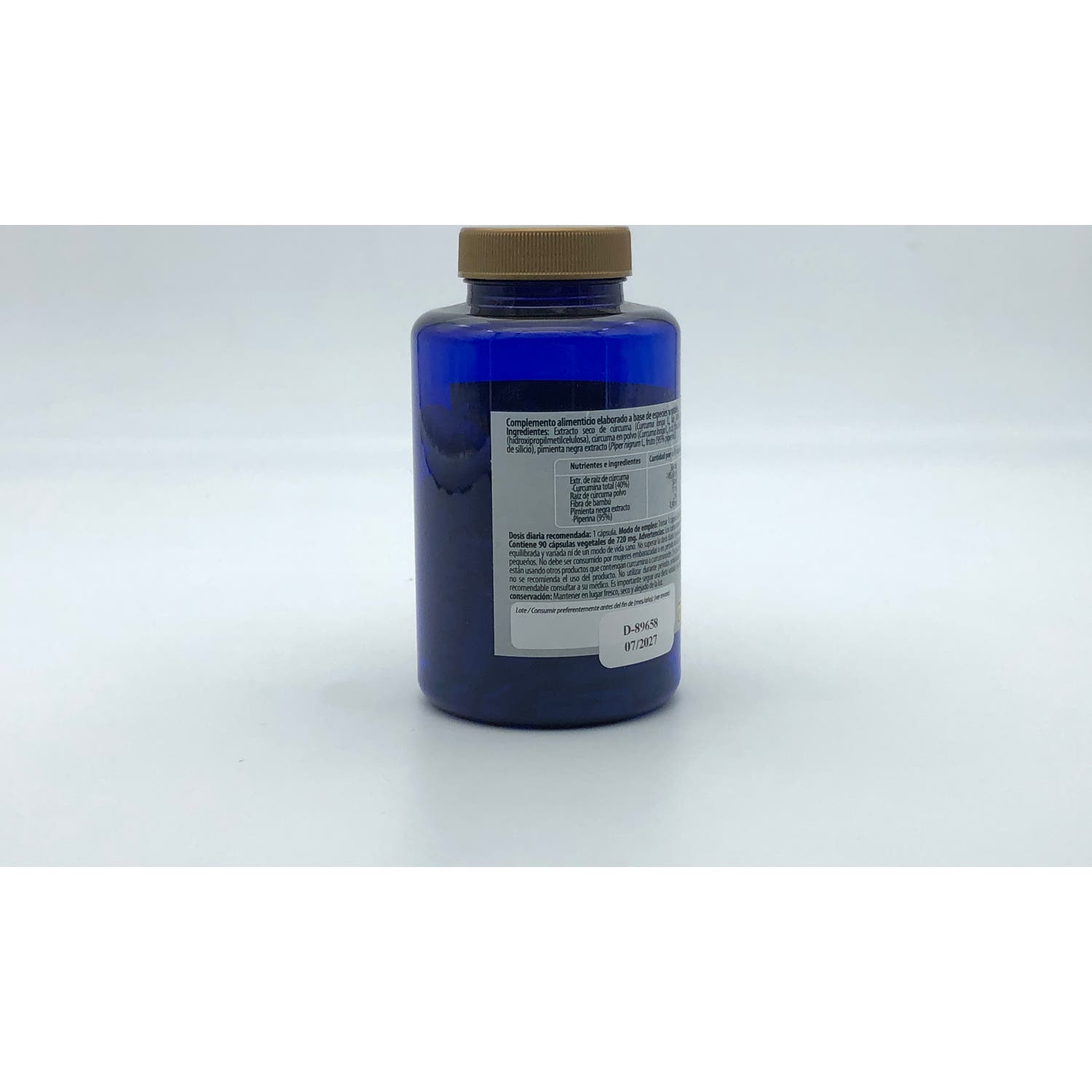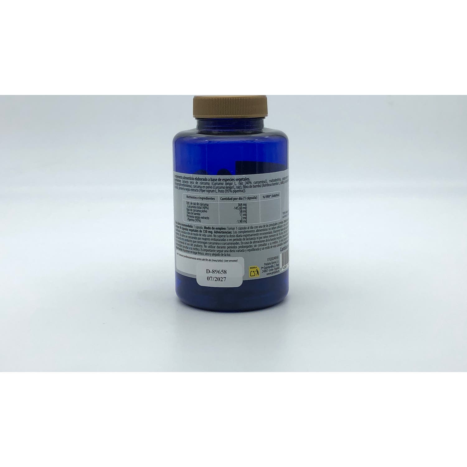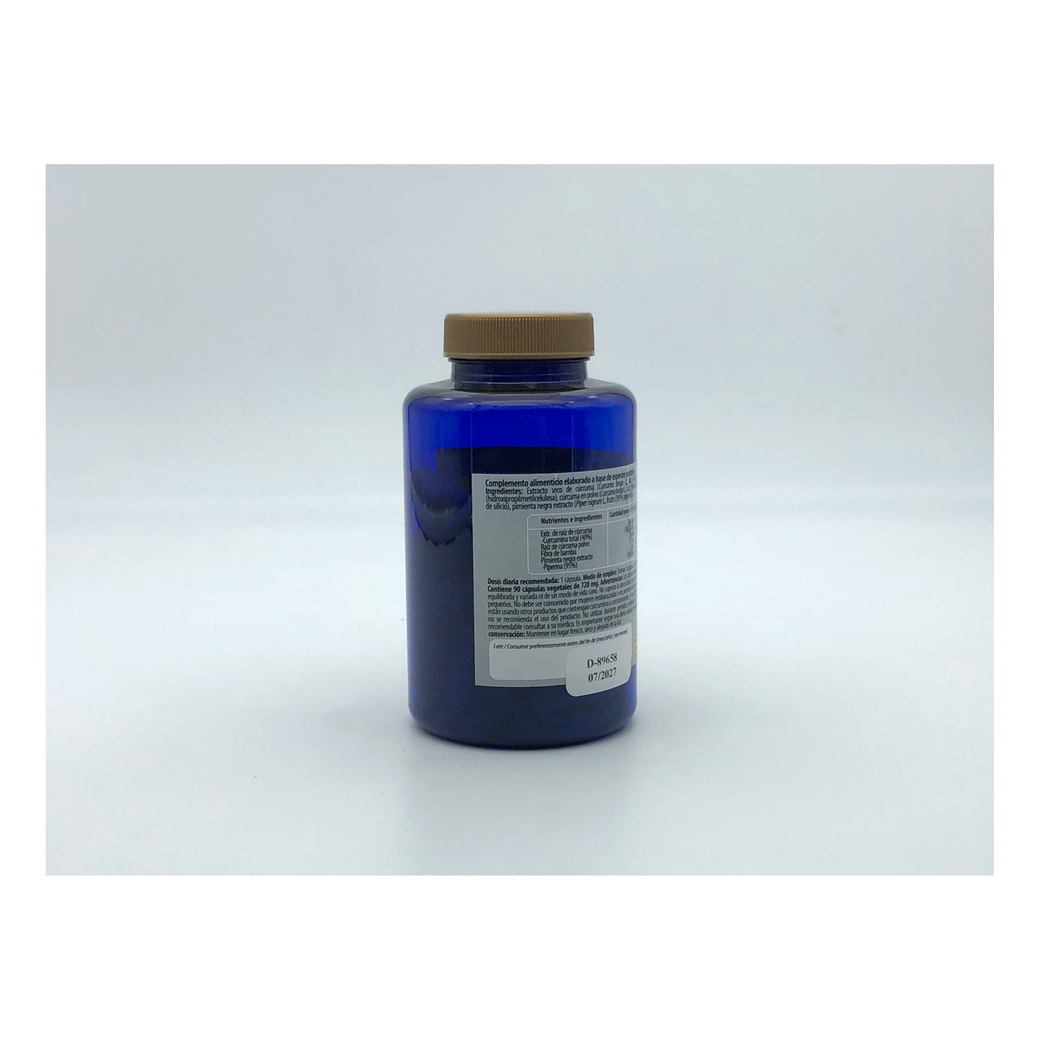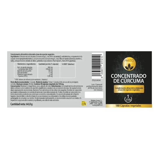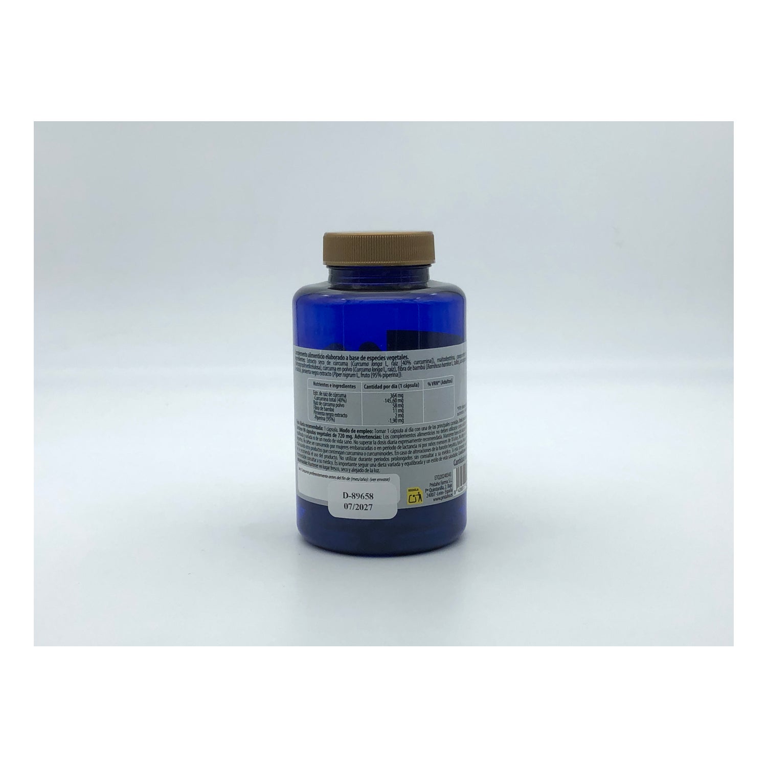 Ingredientes: Extracto seco de cúrcuma (Curcuma Longa L, raíz [40% Curcumina]), Maltodextrina, Componente de la cápsula (hidroxipropilmetilcelulosa), Cúrcuma en polvo (Curcuma Longa L, raíz), Fibra de bambu (Bambusa bambos L, tallo), Antiaglomerante (Dioxido de Silicio), Pimienta negra extracto (Piper nigrum L, fruto [95% Piperina])