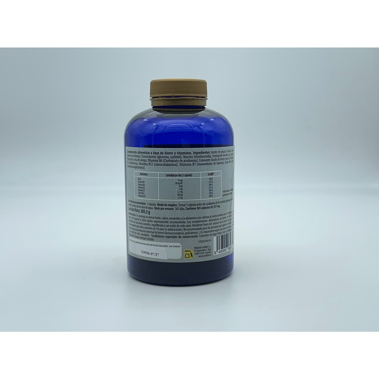 Aceite de girasol, Gelatina, Gluconato ferroso, Humectantes (glicerina, sorbitol), Nicotinamida (niacina), Emulgente (lecitina (de girasol)), Espesante (cera de abeja), Clorhidrato de piridoxina (vitamina B6), Colorante (óxido de hierro marrón), Riboflavina (vitamina B2), Cianocobalamina (vitamina B12), Mononitrato de tiamina (vitamina B1), Ácido pteroilmonoglutámico (ácido fólico).
