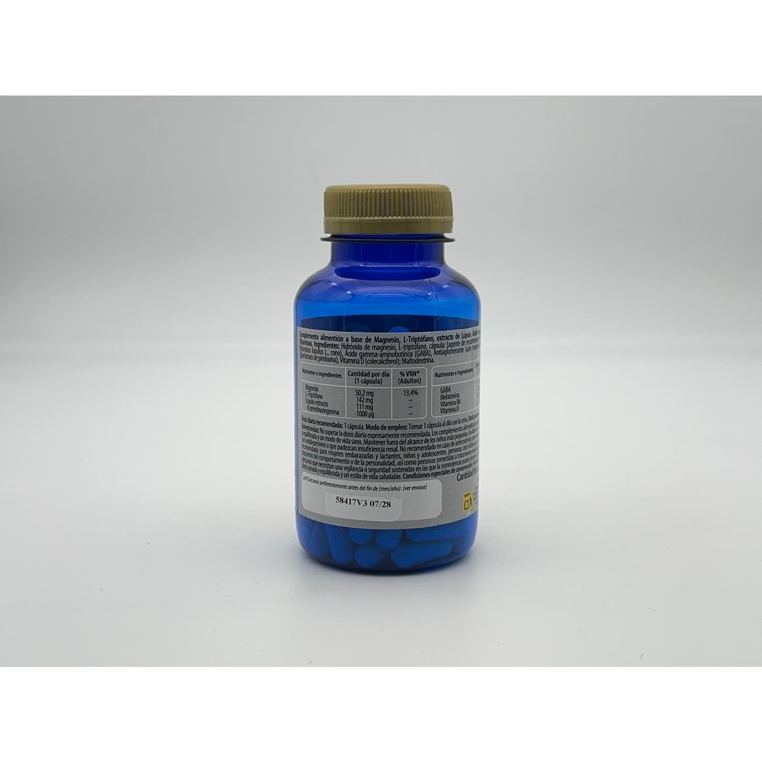 Complemento alimenticio a base de Magnesio, L-Triptófano, extracto de Lúpulo, Ácido Gamma-Aminobutírico (GABA), Melatonina y Vitaminas.