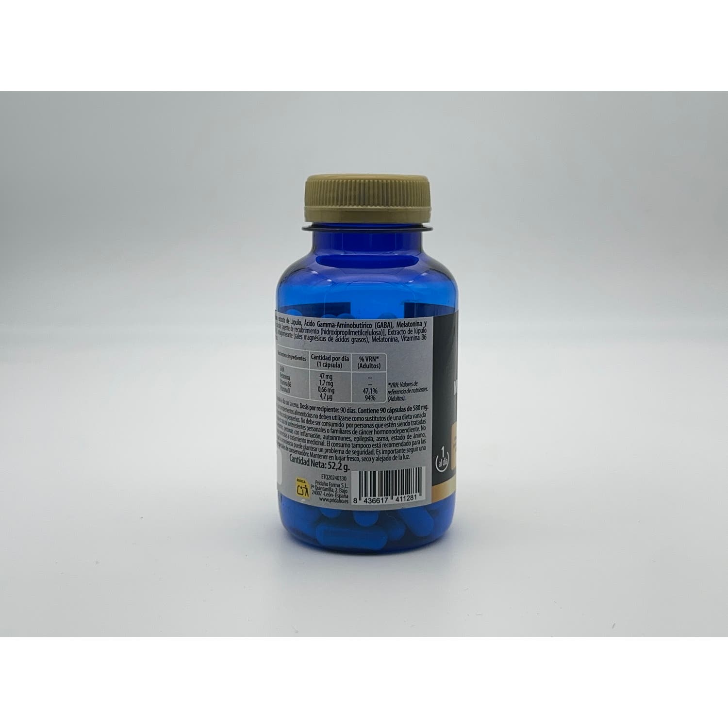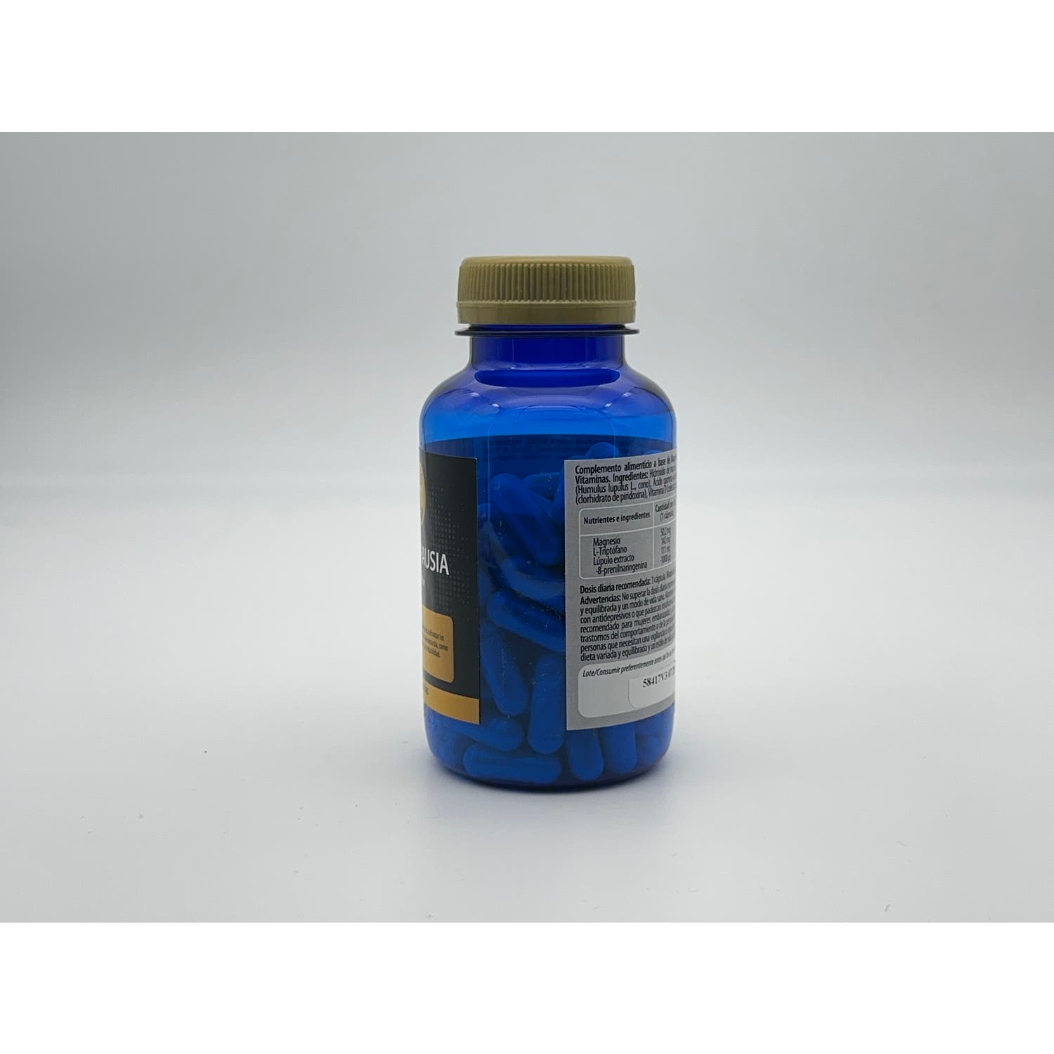 Ingredientes: Hidroxido de magnesio, L-Triptófano, cápsula [Agente de recubrimiento (hidroxipropilmetilcelulosa)], Extracto de Lúpulo (Humulus lupulus, cono), Ácido Gamma- Aminobutírico (GABA), antiaglomerante (sales magnésicas de ácidos grasos), melatonina, clorhidrato de piridoxina (vitamina B6), colecalciferol (Vitamina D); maltodextrina.