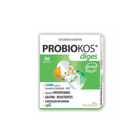 Phytogold Probiokos Diges es un complemento alimenticio que presenta una fórmula integral compuesta por enzimas digestivas y probióticos. Este producto está diseñado para contribuir al equilibrio de la flora intestinal y optimizar el proceso de digestión de: