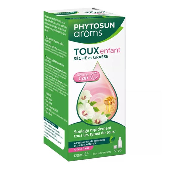 Phytosun Arôms Jarabe para Tos Seca y Grasa Infantil 120ml está diseñado para aliviar rápidamente la tos seca o grasa de los niños.Este jarabe contiene extracto seco de malvavisco y miel, que actúan como un bálsamo calmante sobre la mucosa faríngea inflamada. El mucílago contenido en el extracto seco de malvavisco también forma una película protectora contra partículas extrañas, virus, bacterias y alérgenos.A partir de 1 año.No debe ser utilizado por mujeres embarazadas o en período de lactancia.No contiene alcohol, lactosa, gluten, colorantes artificiales ni OGM.