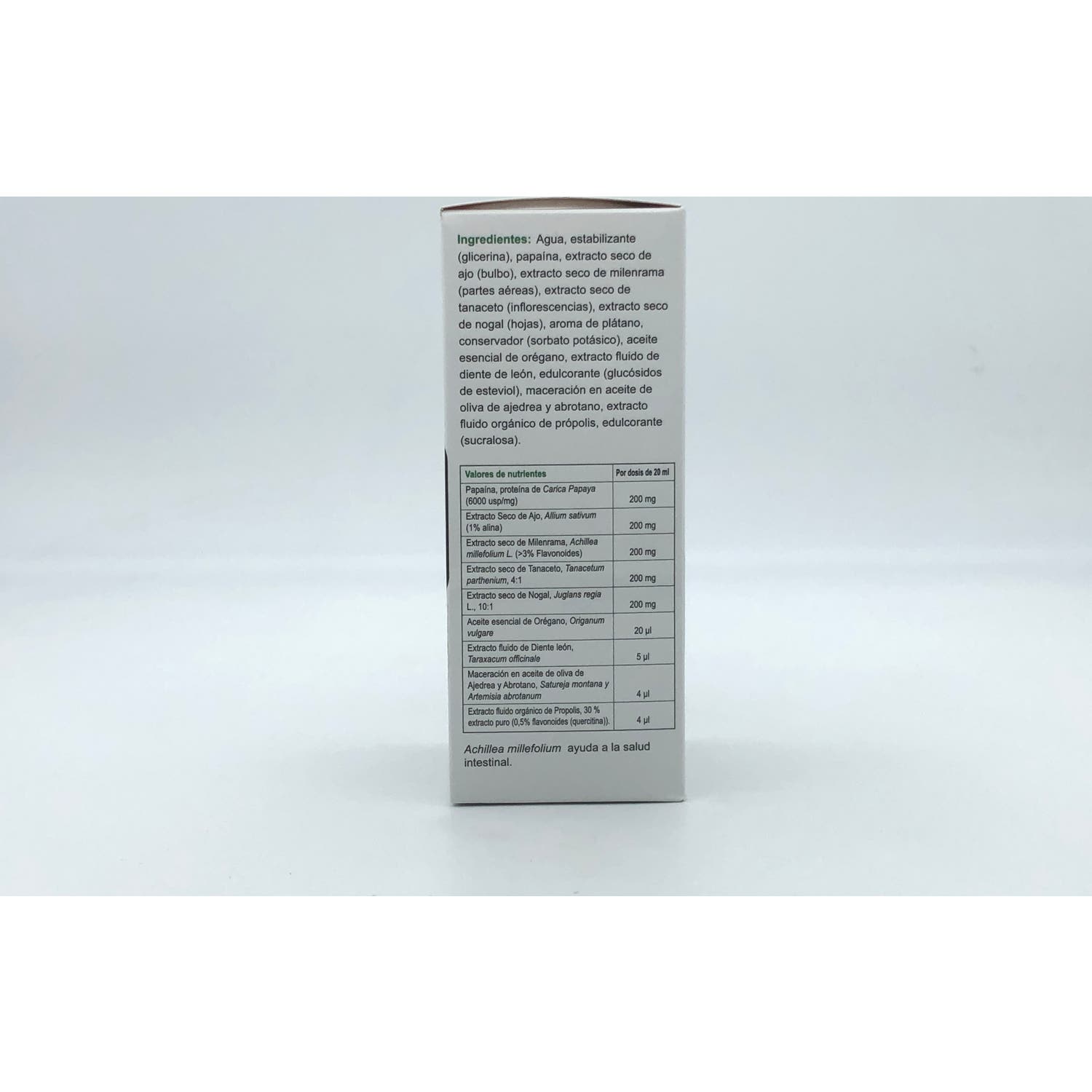Es un complemento nutricional que ayuda a eliminar parásitos intestinales. Elaborado con papaína una proteína vegetal con enzimas digestivas. Con extracto de ajo seco, extracto seco de milenrama, de tanaceto, extracto seco de nogal. Contiene aceite esencial de orégano con propiedades antiparasitarias, aceite de oliva de ajedrea, abrótano, satureja montana y artemisia. Con ingredientes antihelmínticos y extracto fluido de própolis verde. Indicado para niños a partir de los 6 años.