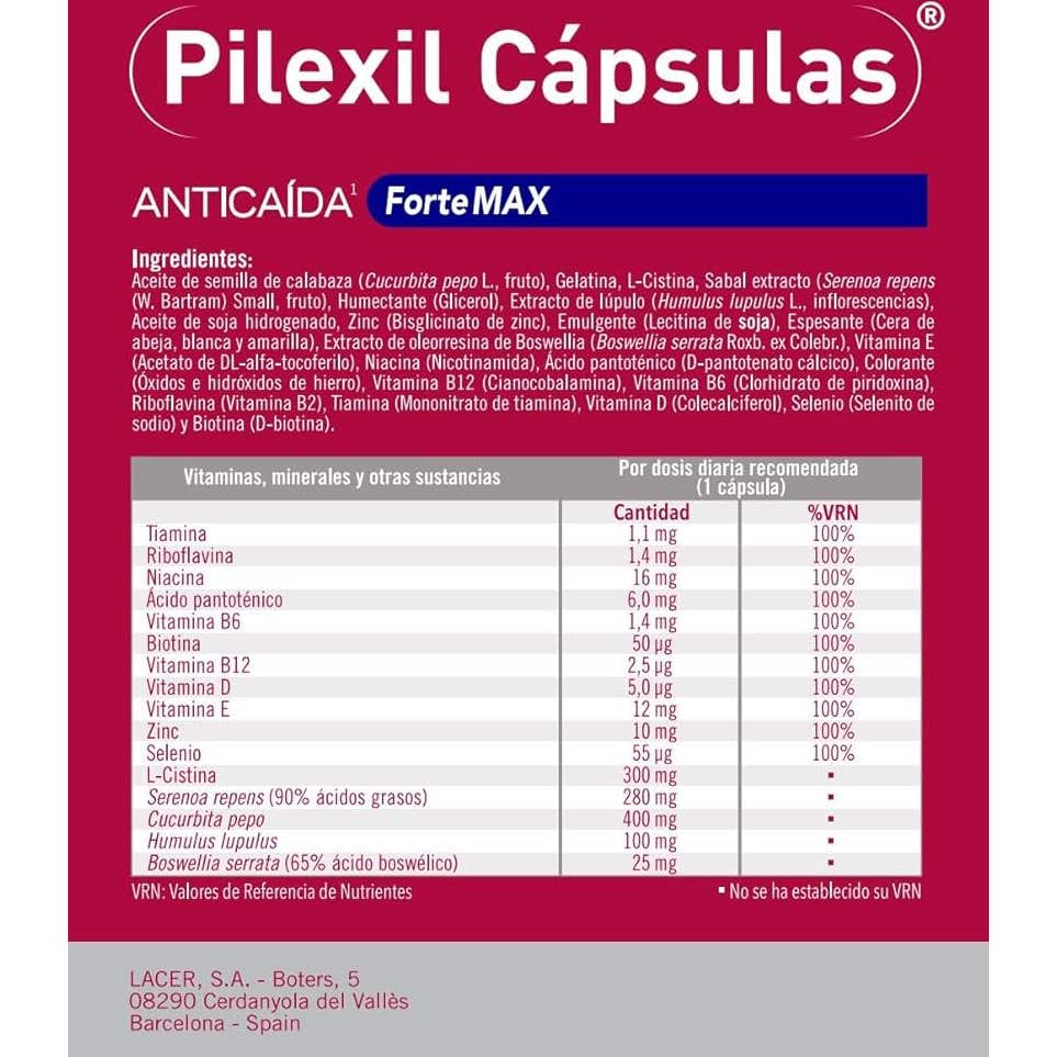 Pilexil Forte Max Anticaída 2x60caps es un complemento alimenticio diseñado para contribuir a la fortaleza y nutrición del cabello y las uñas. Su fórmula innovadora incluye una combinación de extractos de plantas, vitaminas y minerales que ayudan a revitalizar y anclar el bulbo piloso, siendo adecuado tanto para hombres como para mujeres que experimentan caída progresiva del cabello.