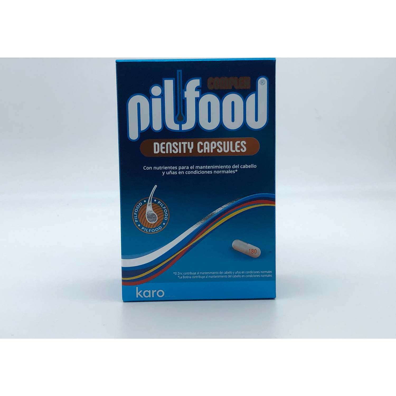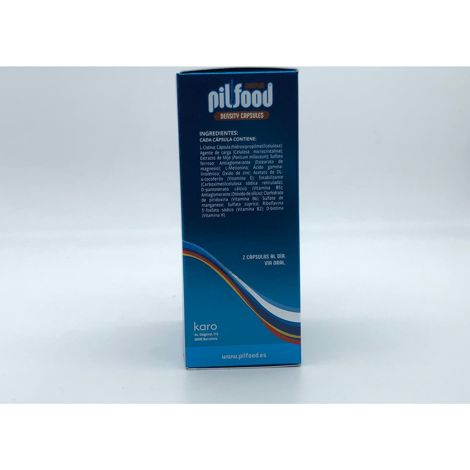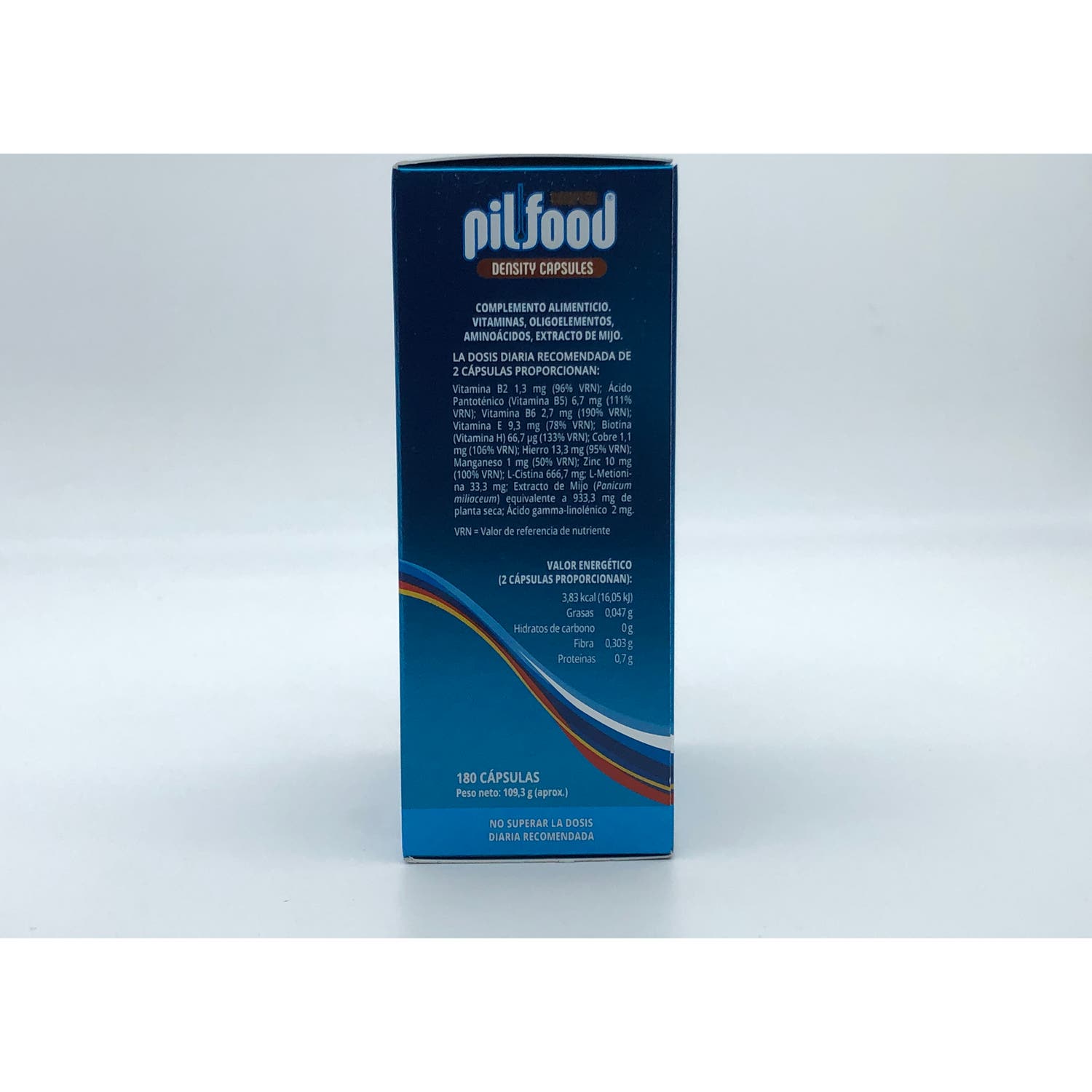 Pilfood Complex Density 180caps combate la caída del cabello desde el interior, interactuando en el mismo bulbo piloso, que es la parte viva del pelo. Es adecuado para hombres y mujeres con pérdida de cabello, frágil o dañado.Contiene: zinc y biotina (contribuye al mantenimiento del cabello en condiciones normales); extracto seco de mijo (ayuda a formar queratina); Vitaminas B2, B5, B6, E y H (retardan en deterioro capilar); metionina y cistina (ayudan a producir cabello); hierro, cobre, manganeso y zinc (estimulan crecimiento y recuperación del cabello); ácido gamma-linolénico (aporta fuerza y brillo). Para obtener los mejores resultados, es necesario tomar este complemento alimenticio rico en nutrientes durante un período de al menos 3 meses. Los primeros efectos visibles son notables después de 6-8 semanas de un uso continuo.