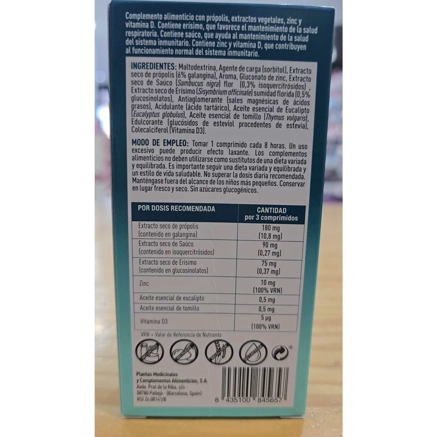 Complemento alimenticio en forma de comprimidos para disolver en la boca, elaborado a base de própolis, erísimo, saúco y aceites esenciales de eucalipto y tomillo. Este complemento favorece la: