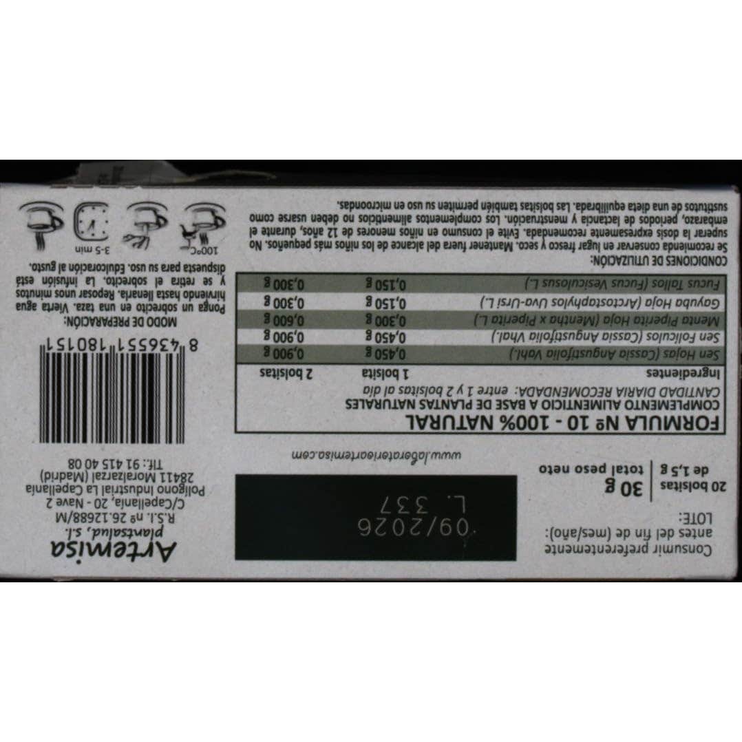 Infusión elaborada a base de plantas naturales que ayudan a mejorar una digestión difícil y pesada, contribuyendo a la extracción de toxinas de forma natural. Su contenido de sen, menta, fucus y gayuba, ayuda a purificar el organismo, contribuyendo a eliminar la sensación de inflamación del estómago y vientre, además de ayudar a digerir bien los alimentos y favorecer a la combustión de las grasas y líquidos, contribuyendo al mantenimiento y/o pérdida de peso.