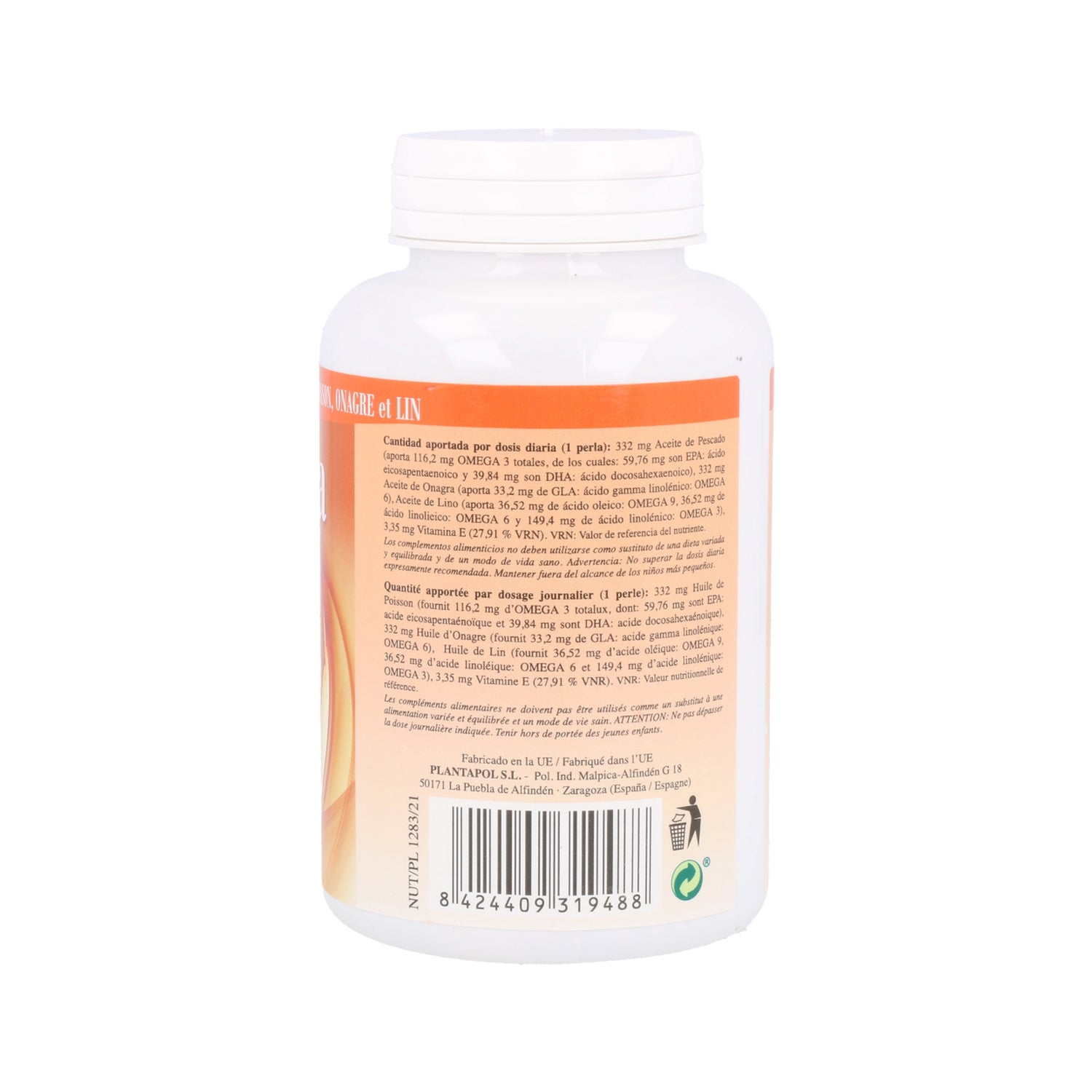 Aceite de Pescado (332 mg), Aceite de Onagra (332 mg), Aceite de Lino (332 mg), Envoltura (gelatina, glicerol), Vitamina E.