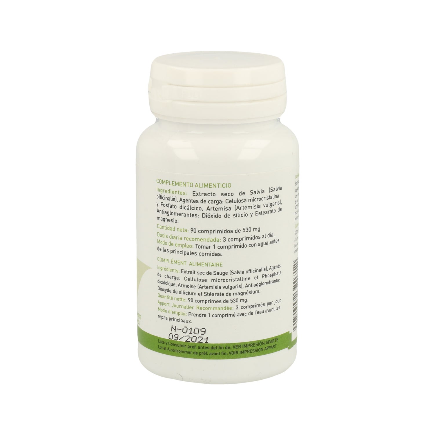 Extracto seco de Salvia (Salvia officinalis), Artemisa (Artemisia vulgaris), Agentes de carga: Celulosa microcristalina y Fosfato dicálcico, Antiaglomerantes: Dióxido de silicio y Estearato de magnesio.