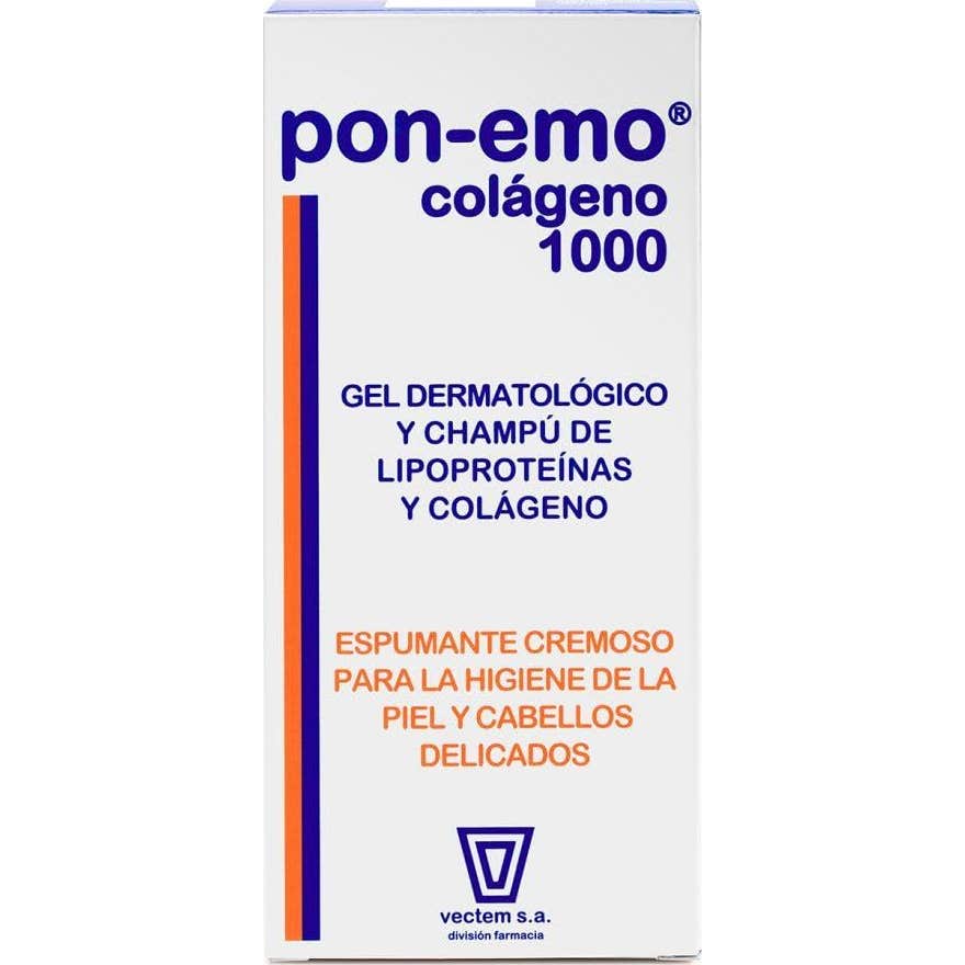 Pon-Emo Colágeno 1l es un gel y champú elaborado a base de lipoproteínas para la higiene diaria de pieles y cabellos frágiles, sensibles e intolerantes a geles o champús convencionales. Posee unos altos niveles de tolerancia cutánea.