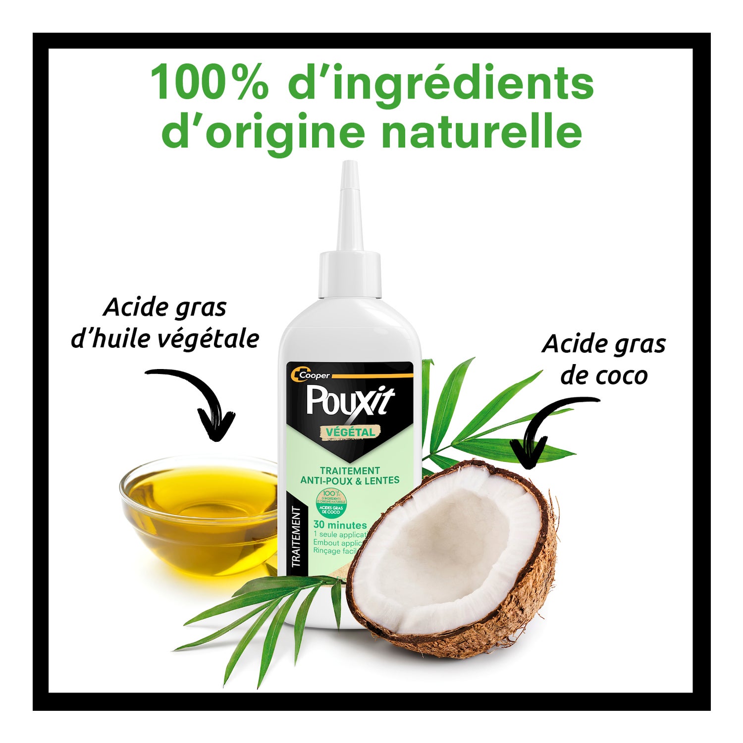 Pouxit Végétal Tratamiento Antipiojos y Liendres 200ml + Peine es un tratamiento que actúa en sólo 30 minutos, mediante un efecto físico, para restablecer la salud del cuero cabelludo.Su fórmula totalmente natural a base de un complejo de ácidos grasos de coco y aceite vegetal de origen natural obstruye los orificios respiratorios y excretores del piojo y la liendre, provocando su muerte. Pouxit Végétal también actúa deshidratando al piojo y a la liendre, provocando su muerte por desecación. Gracias a una práctica punta aplicadora, este tratamiento es fácil de usar, ofreciendo una formulación suave para el cuero cabelludo.Indicado para el cuero cabelludo de adultos y niños mayores de 6 meses.Peine incluido.