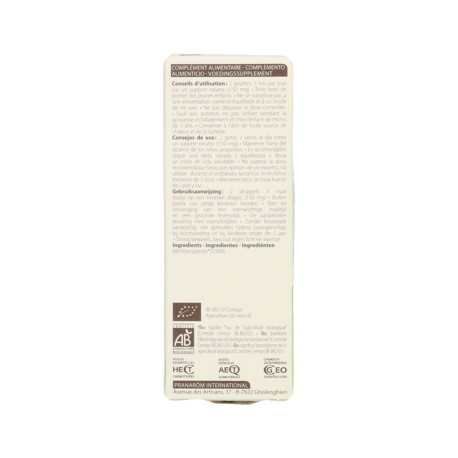 El aceite esencial de menta (Mentha piperita) es tonificante. Su efecto antiespasmódico calma las indigestiones y las nauseas, así como los mareos causados por los viajes. Gracias a su efecto analgésico, este aceite es un soporte en el caso de dolor por traumatismo, tendinitis, ciática, reumatismo, cefalea o neuralgia. Asimismo, tiene un efecto refrescante. También tiene propiedades antisépticas.