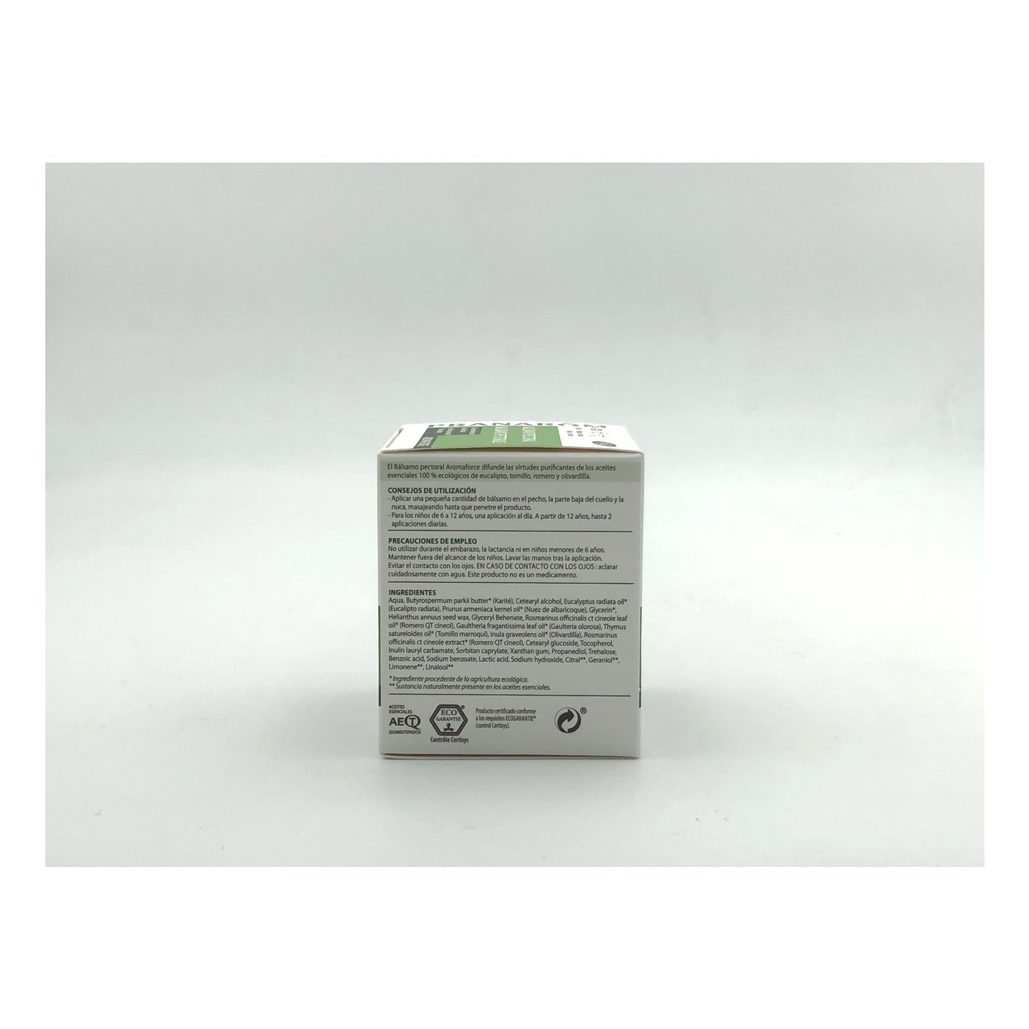 Aqua, Butyrospermum parkii butter* (Karité), Cetearyl alcohol, Eucalyptus radiata oil* (Eucalipto radiata), Prunus armeniaca kernel oil* (Nuez de albaricoque), Glycerin*, Helianthus annuus seed wax, Glyceryl Behenate, Rosmarinus officinalis ct cineole leaf oil* (Romero QT cineol), Gaultheria fragantissima leaf oil* (Gaulteria olorosa), Thymus satureioides oil* (Tomillo marroquí), Inula graveolens oil* (Olivardilla), Rosmarinus officinalis ct cineole extract* (Romero QT cineol), Cetearyl glucoside, Tocopherol, Inulin lauryl carbamate, Sorbitan caprylate, Xanthan gum, Propanediol, Trehalose, Benzoic acid, Sodium benzoate, Lactic acid, Sodium hydroxide, Citral**, Geraniol**, Limonene**, Linalool** Ingrediente procedente de la agricultura ecológica. * Sustancia naturalmente presente en los aceites esenciales.