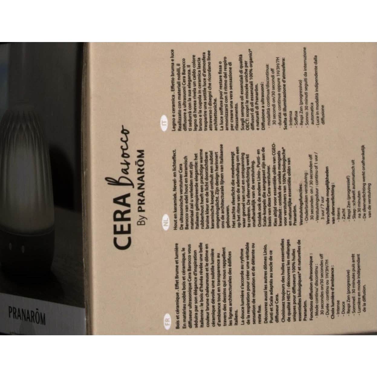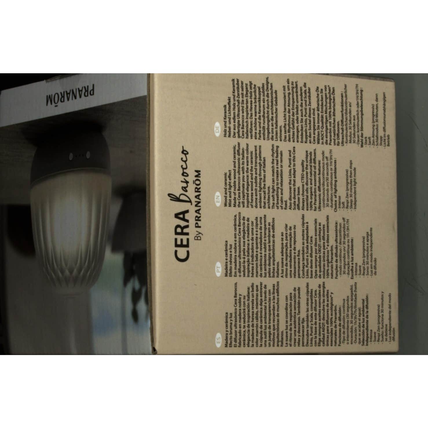 Pranarôm Cera Barocco Difusor Ultrasónico es un difusor de aromas y esencias ultrasónico fabricado en madera noble y cerámica, que tiene un diseño portátil y compacto, con una duración aproximada de hasta 7 horas de aroma por tanque rellenado.