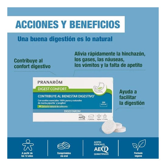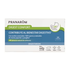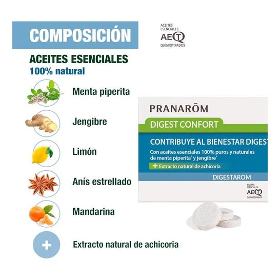 Complemento alimenticio en comprimidos que combina aceites esenciales puros y naturales de menta piperita y jengibre para contribuir al confort digestivo. Además, contiene extracto natural de achicoria, que favorece la buena digestión.