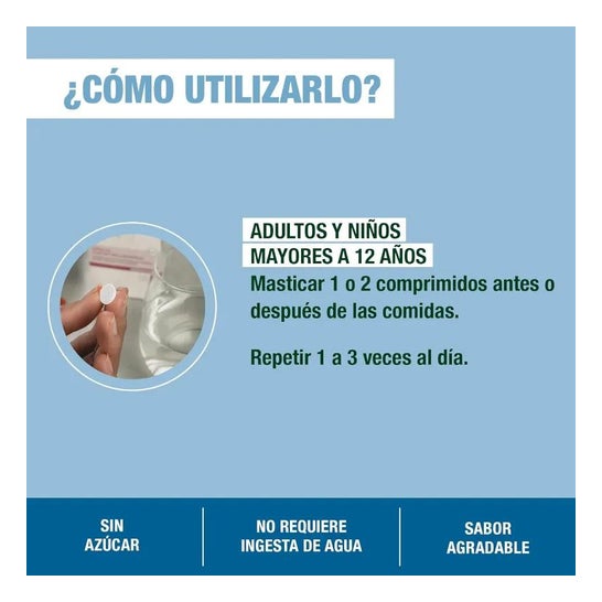 · Adultos y mayores de 12 años: chupar o masticar de 1 a 2 comprimidos, de 1 a 3 veces al día, antes o después de las comidas.