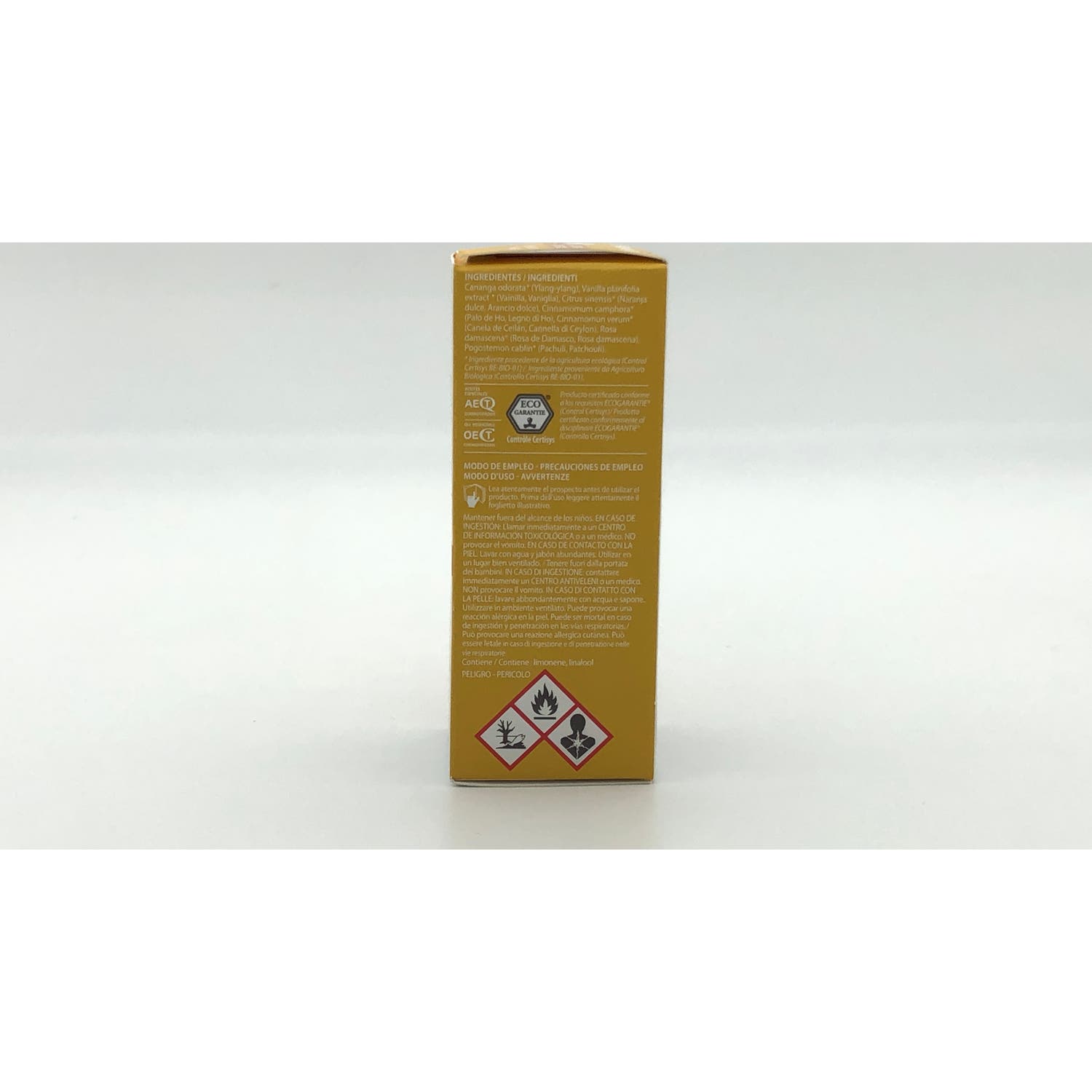 Aceites esenciales 100% ecológicos: ylang-ylang, vainilla, naranja dulce, madera de hô, canela de ceilán, pachuli y rosa de damasco.