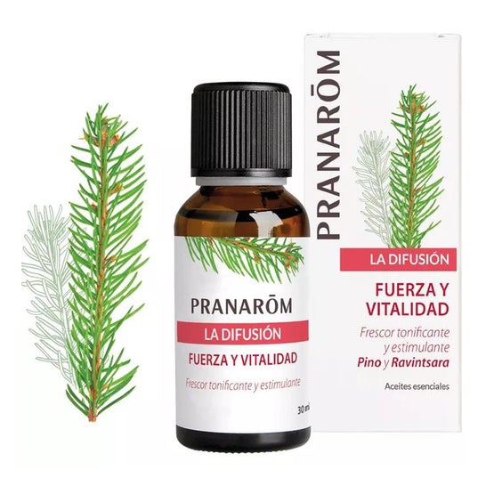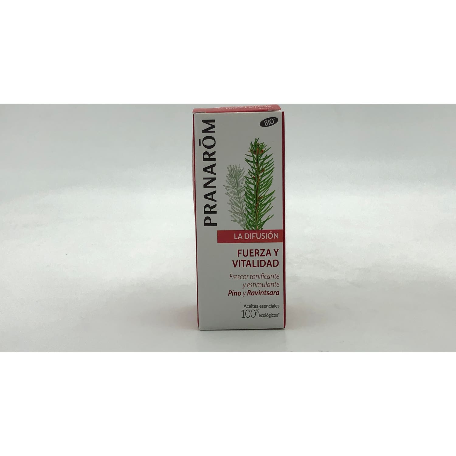 Pranarôm La Difusión Fuerza y Vitalidad BIO 30ml es una sinergia revitalizante y tónica que contiene toda la energía fortalecedora del Pino, del Ravintsara y de la Menta concentrada en una composición olfativa dinamizadora y estimulante.