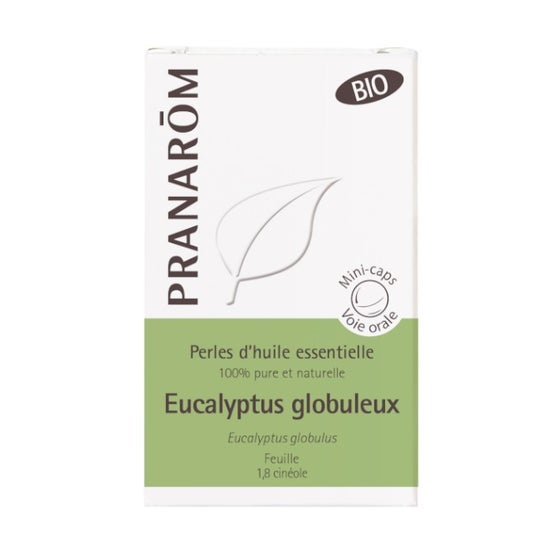 Perlas de aceite esencial de eucalipto (Eucalyptus globulus) Bio en formato mini cápsulas predosificadas con aceite esencial 100% puro y natural de eucalipto globulus. En un formato práctico y con un sabor neutro, son fáciles de tragar. Encontrado en muchas zonas del mundo (España, Chile, India, China, etc.) y ampliamente utilizado por sus propiedades curativas, este hermoso árbol de la gran familia de las mirtacaeas aromáticas tiene propiedades antivirales, antifúngicas, antibacterianas y expectorantes, a la vez que mejora las defensas del organismo.