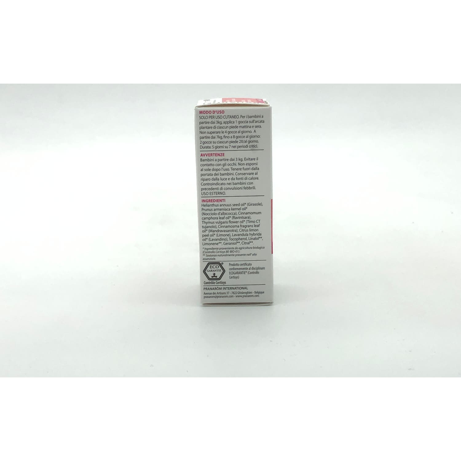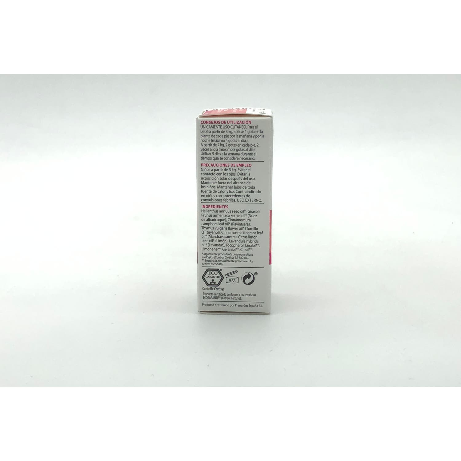 Contiene aceites esenciales 100% ecológicos de Ravintsara, Tomillo quimiotipo tuyanol, Mandravasarotra, Limón, Lavandín y aceites vegetales de Girasol y Nuez de albaricoque. La composición resulta en una mezcla con sinergia aromática para el cuidado del bebé y su sistema inmune.
