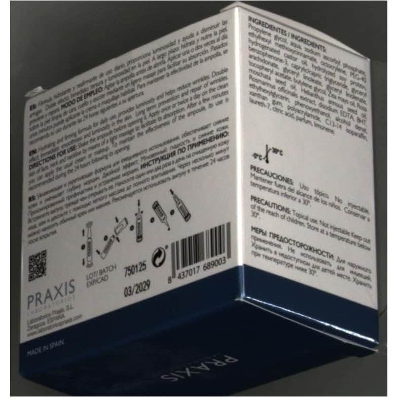 La eficacia de estas ampollas radica en su fórmula que combina proteoglicanos y vitaminas antioxidantes como la C, E y F, junto con filtros solares. Estos ingredientes actúan de manera conjunta para: