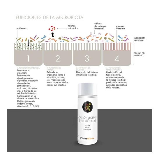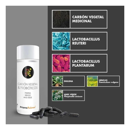 Cápsulas de carbón vegetal probiotico indicadas para ayudar en las digestiones dificiles. El carbón vegetal ya es de por sí un aliado para las digestiones dificiles, aerofagias y problemas intestinales, al añadir un probiotico además conseguimos que la flora intestinal se equilibre para lograr solucionar estos problemas de raíz al fortalecer el sistema digestivo.