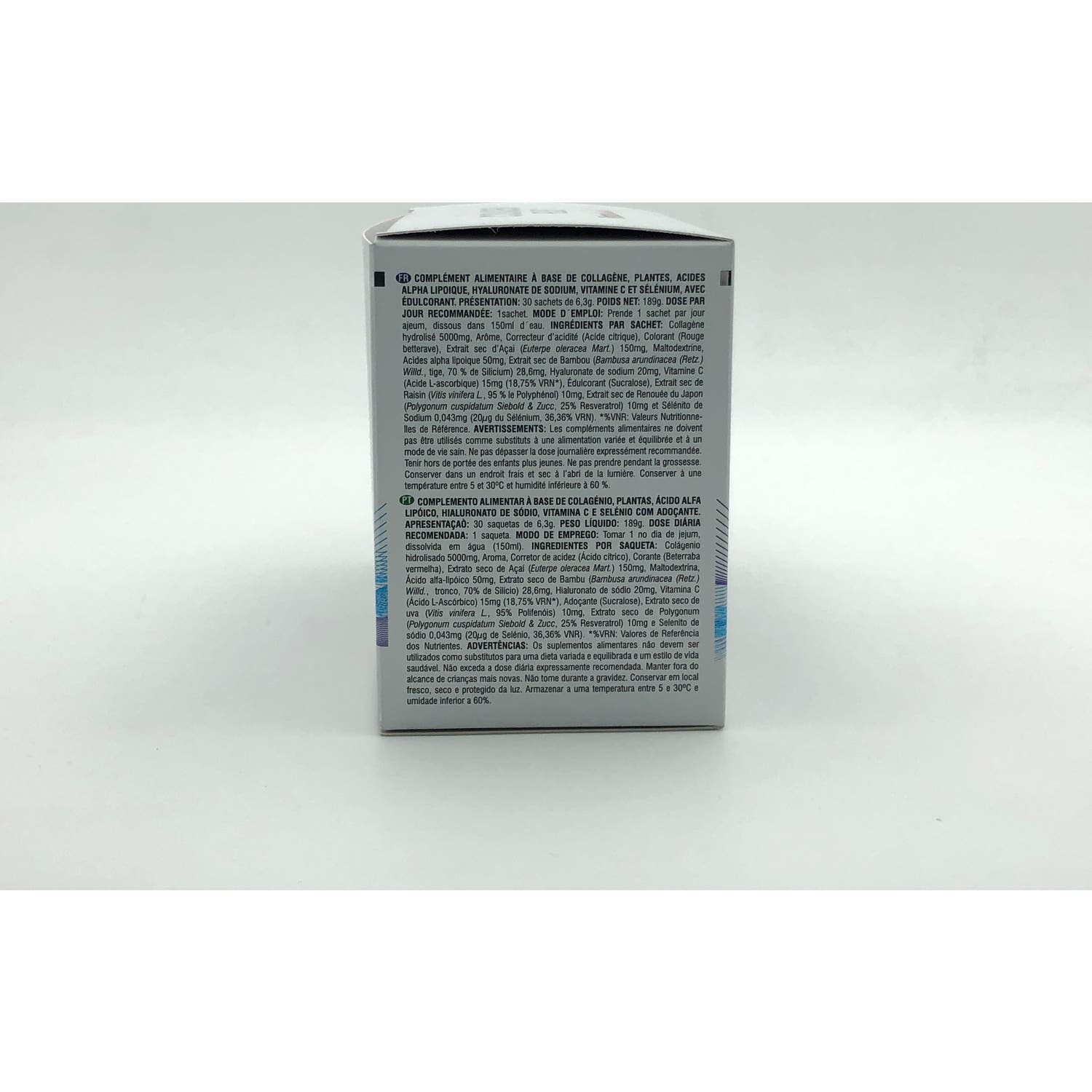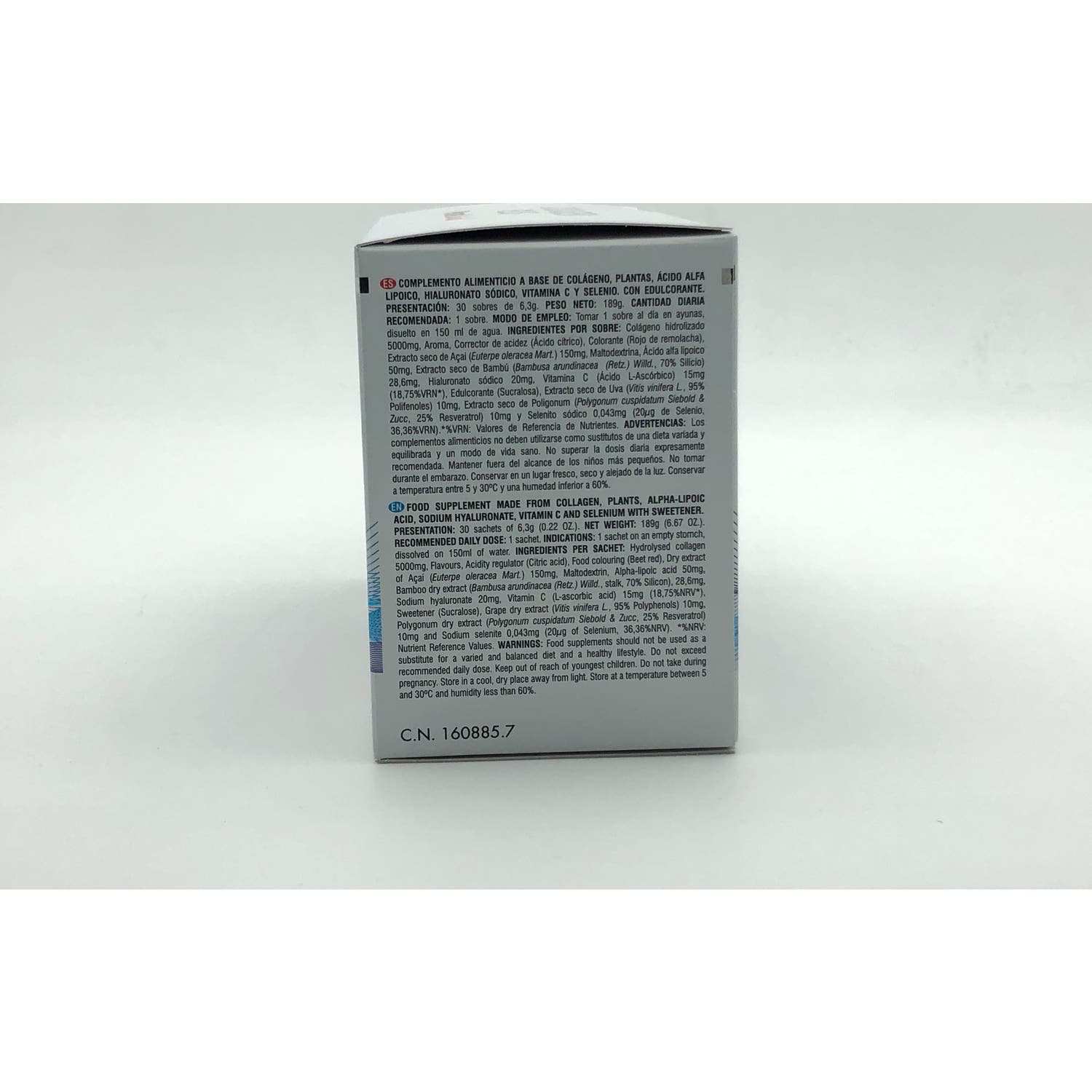 Ingredientes por 1 sobre: Colágeno porcino hidrolizado 5000mg, Aroma, Corrector de acidez (Ácido cítrico), Colorante (Rojo de remolacha), Extracto seco de Açai (Euterpe oleracea Mart.) 150mg, Maltodextrina, Ácido alfa lipoico 50mg, Extracto seco de Bambú (Bambusa arundinacea (Retz.) Willd., 70% Silicio) 28,6mg, Hialuronato sódico 20mg, Vitamina C (Ácido L-ascórbico) 15mg (18,75%VRN*), Edulcorante (Sucralosa), Extracto seco de Uva (Vitis vinífera L., 95% Polifenoles) 10mg, Extracto seco de Poligonum (Polygonum cuspidatum Siebold & Zucc., 25% Resveratrol) 10mg y Selenito de sodio 0,043mg (20μg de Selenio, 36,36%VRN*). *%VRN: Valores de Referencia de Nutrientes.