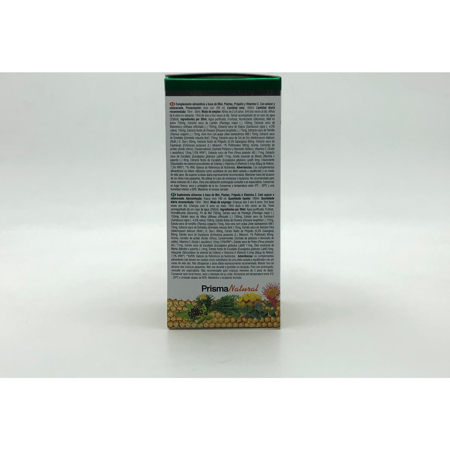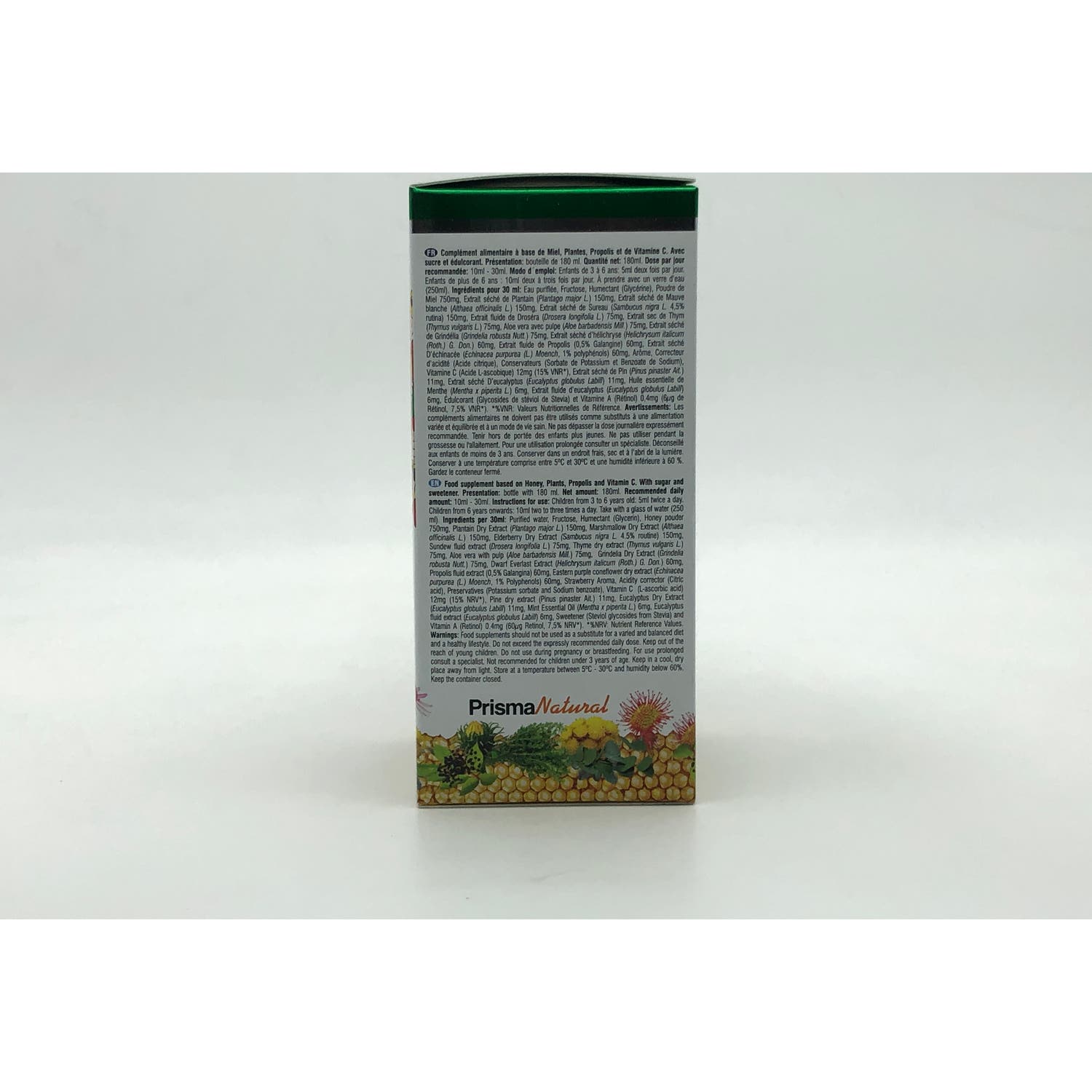 Ingredientes por 30 ml: Agua purificada, Fructosa, Humectante (Glicerina), Miel en polvo 750 mg, Extracto seco de Llantén (Plantago major L.) 150 mg, Extracto seco de Malvavisco (Althaea officinalis L.) 150 mg, Extracto seco de Saúco (Sambucus nigra L., 4,5% rutina) 150 mg, Extracto fluido de Drosera (Drosera longifolia L.) 75 mg, Extracto seco de Tomillo (Thymus vulgaris L., 75 mg, Aloe vera con pulpa (Aloe barbadensis Mill.) 75 mg, Extracto seco de Grindelia (Grindelia robusta Nutt.) 75 mg, Extracto seco de Sol de Oro (Helichrysum italicum (Roth.) G. Don.) 60 mg, Extracto fluido de Própolis (0,5% Galangina) 60 mg, Extracto seco de Equinácea (Echinacea purpurea (L.) Moench, 1% Polifenoles) 60mg, Aroma, Corrector de acidez (Ácido cítrico), Conservadores (Sorbato potásico y Benzoato sódico), Vitamina C (Ácido L-ascórbico) 12 mg (15%VRN*), Extracto seco de Pino (Pinus pinaster Ait.) 11mg, Extracto seco de Eucalipto (Eucalyptus globulus Labill) 11mg, Aceite esencial de Menta (Mentha x piperita L.) 6mg, Extracto fluido de Eucalipto (Eucalyptus globulus Labill) 6mg, Edulcorante (Glucósidos de esteviol procedentes de Estevia) y Vitamina A (Retinol) 0,4mg (60μg de Retinol, 7,5%VRN*).*%VRN: Valores de Referencia de Nutrientes.