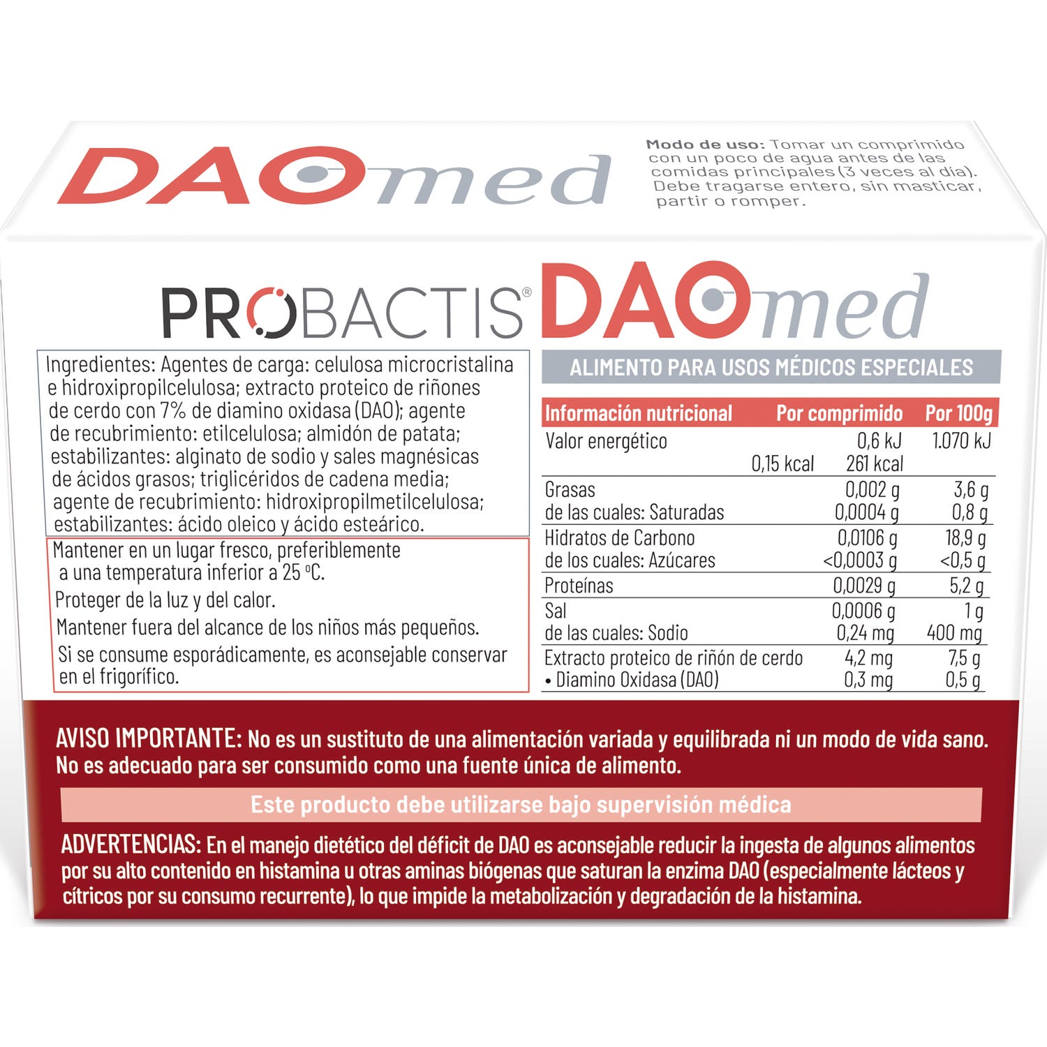Probactis Daomed 60 Minicomprimidos es un alimento para usos médicos especiales a base de la enzima DAO (Diamino Oxidasa) para el manejo dietético de las patologías asociadas al déficit de DAO e intolerancia a la histamina en niños y adultos.