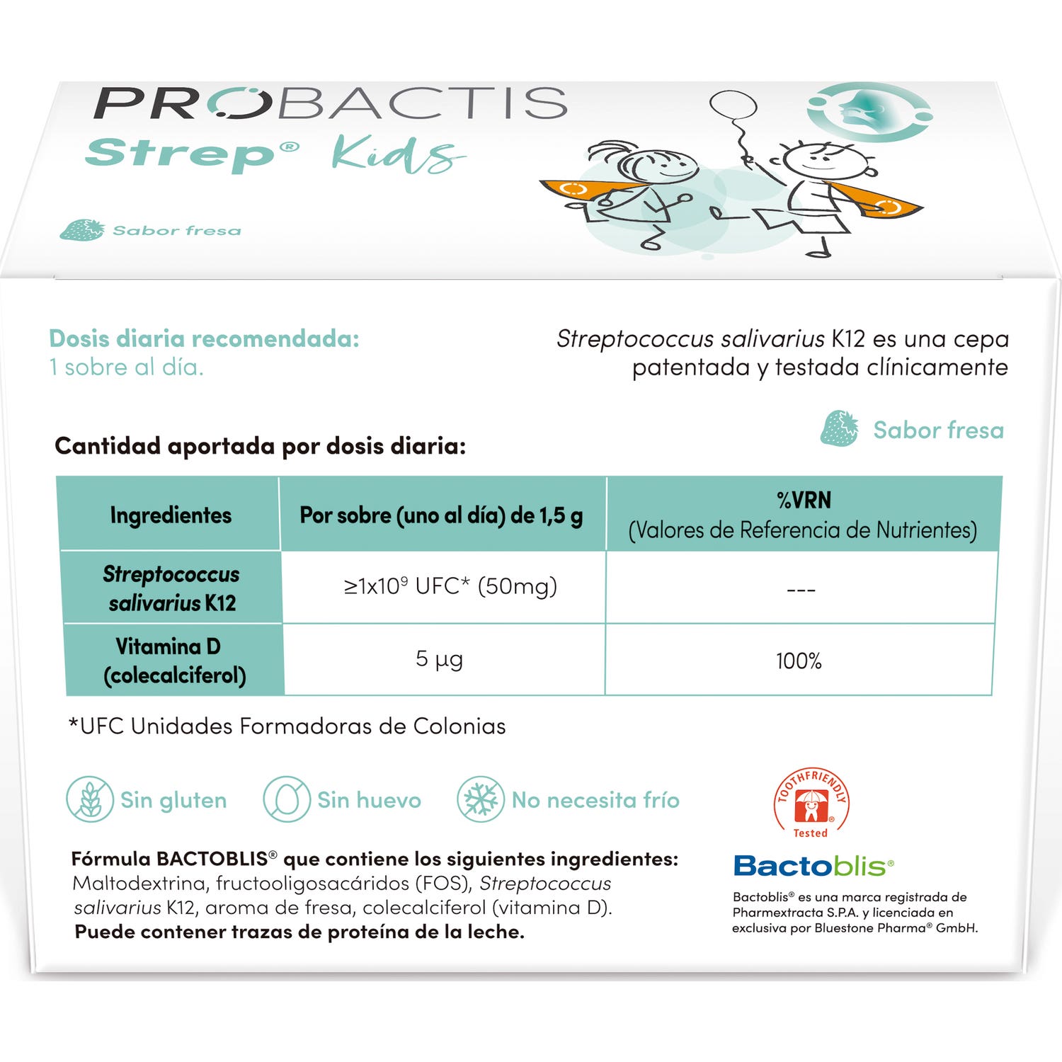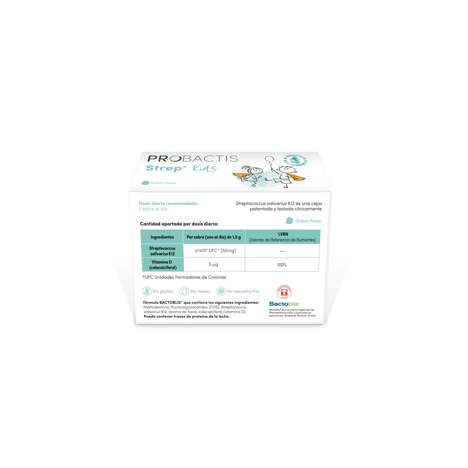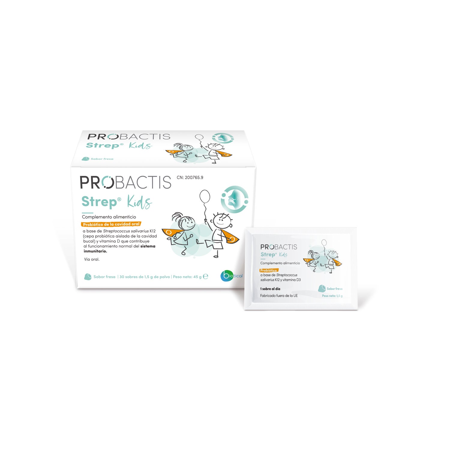 Probactis Strep Kids Fresa 30 sobres es un complemento alimenticio para niños. Contiene Streptococcus salivarius K12, el cual contribuye a disminuir el padecimiento de infecciones de garganta a causa de los estreptococos, ayudando también a que los niños experimenten una disminución en las infecciones de oído.