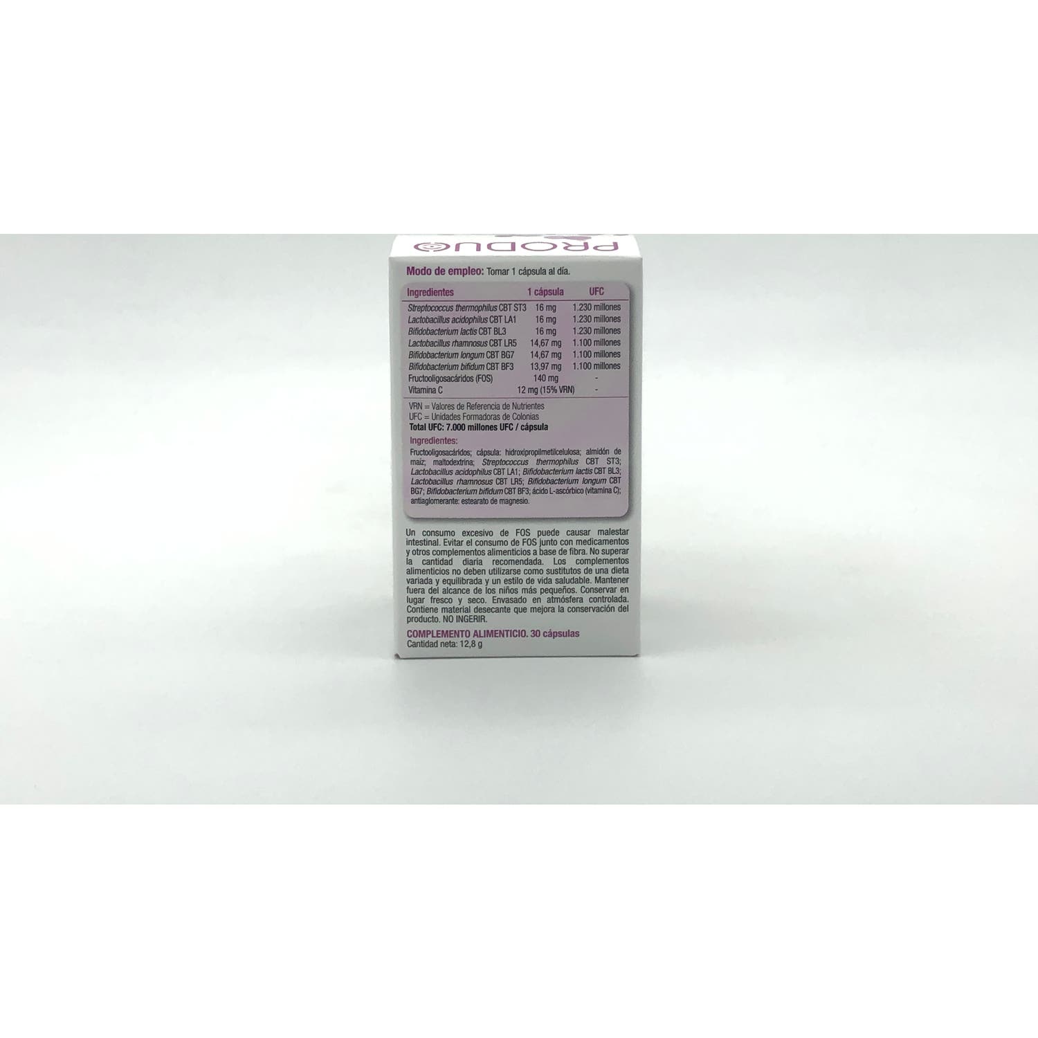 Streptococcus Thermophilus, Lactobacillus Acidophilus, Bifidobacterium Lactis, Lactobacillus Rhamnosus, Bifidobacterium Longum, Bifidobacterium Bifidum, Fructooligosacáridos (FOS), Vitamina C.