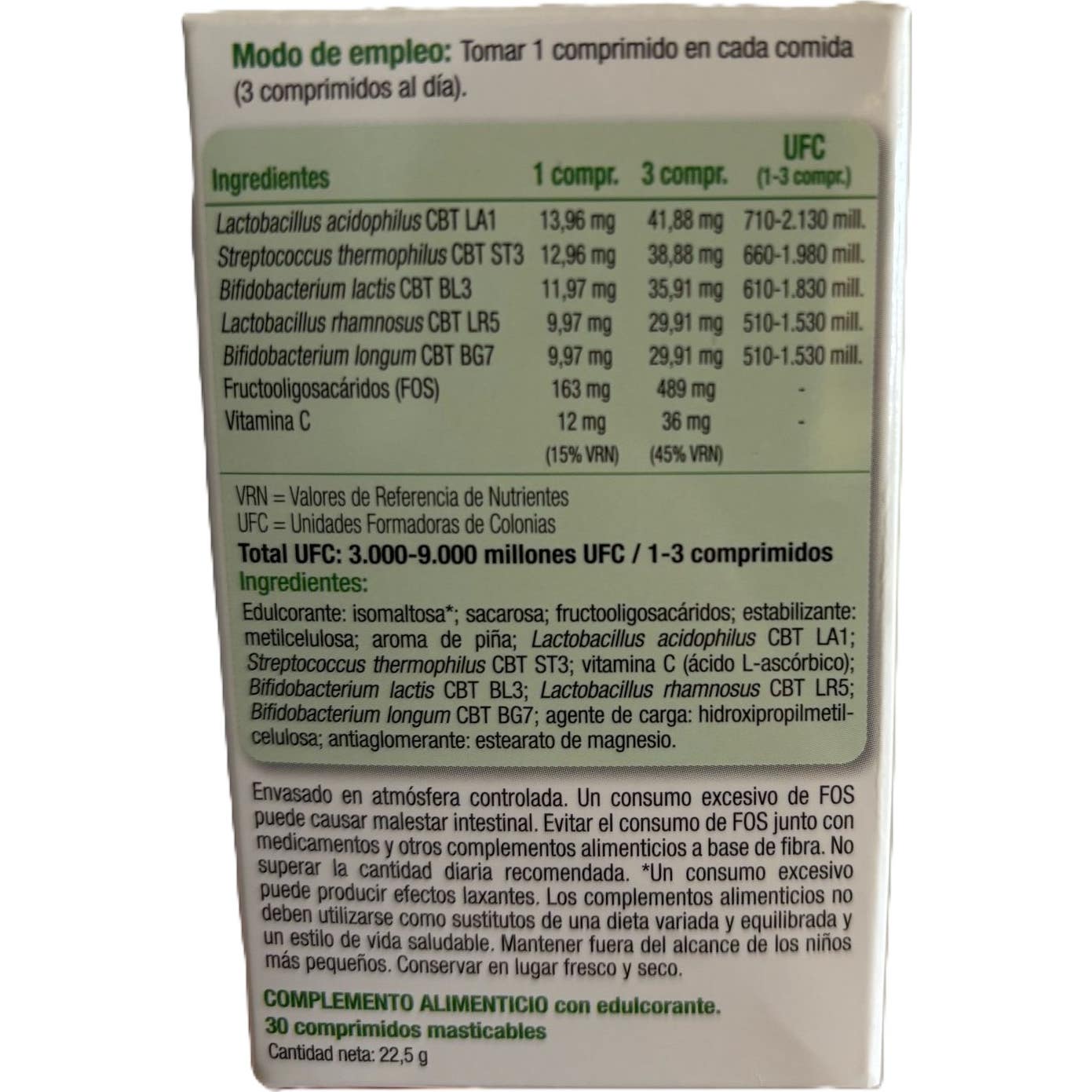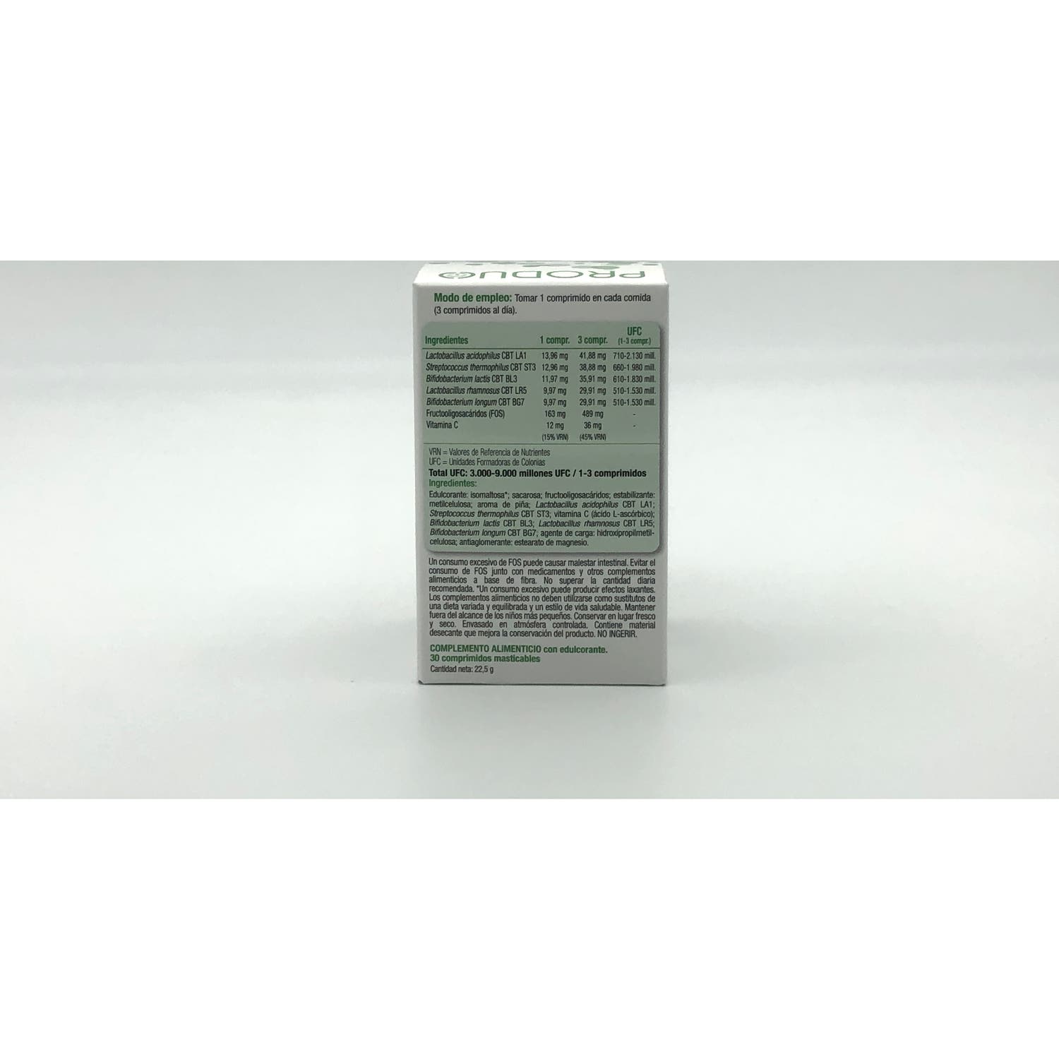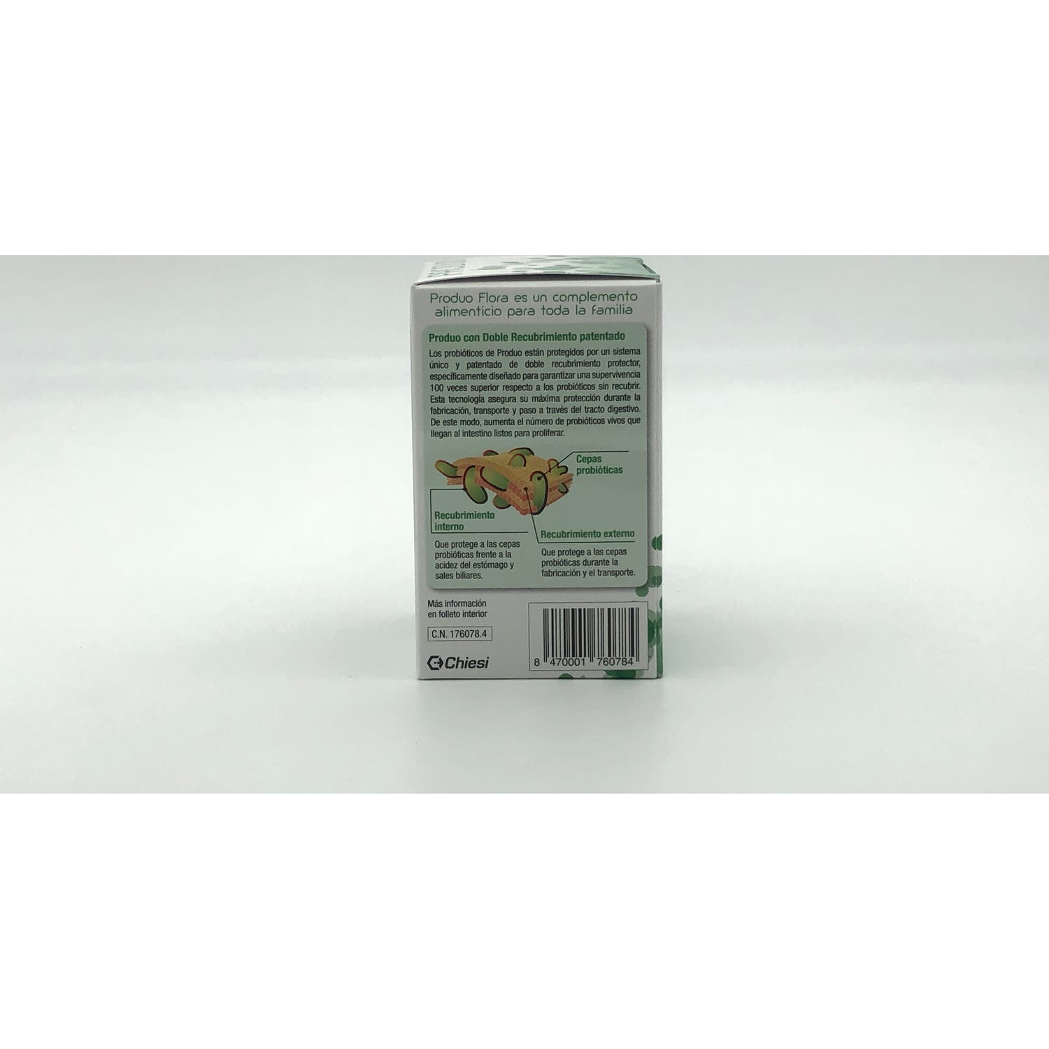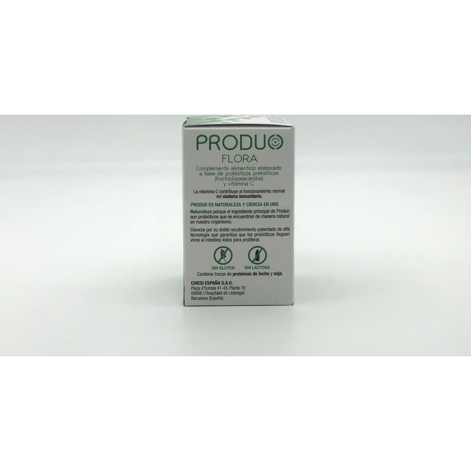 Produo® Flora combina los beneficios de la vitamina C con la de varias cepas de probióticos. Lactobacillus acidophilus (LA1): actúan sobre la pared intestinal como efecto barrera ante patógenos nocivos. Lactobacillus rhamnosus (LR3): actúan en el aparato digestivo como inmunoestimulante. Entrerococcus faecium (BL3): producen bacterias que controlan las bacterias patógenas y además realizan un efecto barrera. Bifidobacterium longum (BG7): generan gran cantidad de ácido láctico y ayuda al tránsito intestinal. FOS (fructooligosacáridos): mejoran el crecimiento probiótico y de las bacterias microbiota.