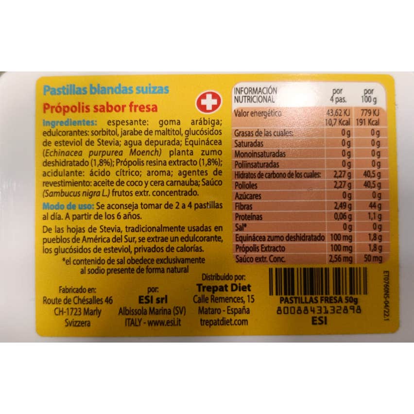 Esi Propolaid Pastillas Blandas Suizas Fresa 50g pastillas blandas de origen suizasa base de própolis, equinácea purpúrea y zumo concentrado de saúco, indicadas en procesos inflamatorios de la cavidad orofaríngea originada por un descenso inmunitario. Además, atenúan la tos, facilita una acción y alivio inmediato. sin azúcar añadido. recomendadas a niños mayores de 6 años.